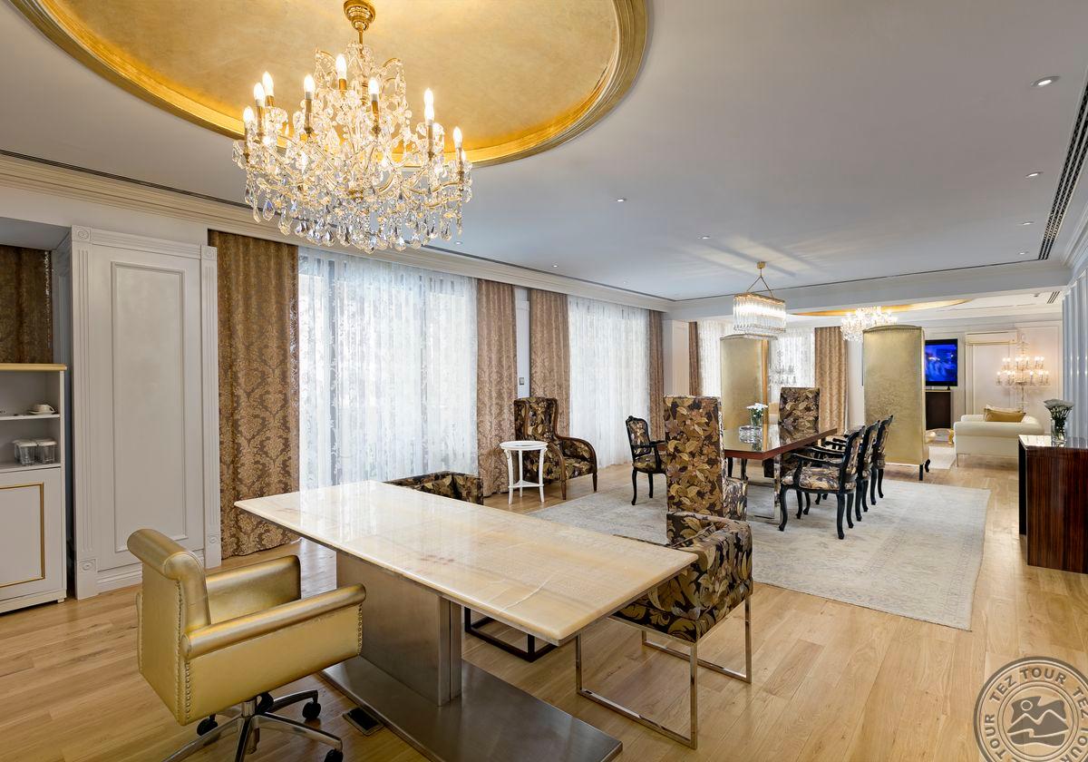 King suite (расположен на 8-м этаже, 2 спальни, 2 ванные комнаты (джакузи, сауна (в одной комнате), 1 кинотеатр-playstation, кухня, рабочий кабинет, гостиная, 2 террасы (на одной террасе шезлонги,зона отдыха, неглубокий бассейн, макс. 5+1, 600 м2).