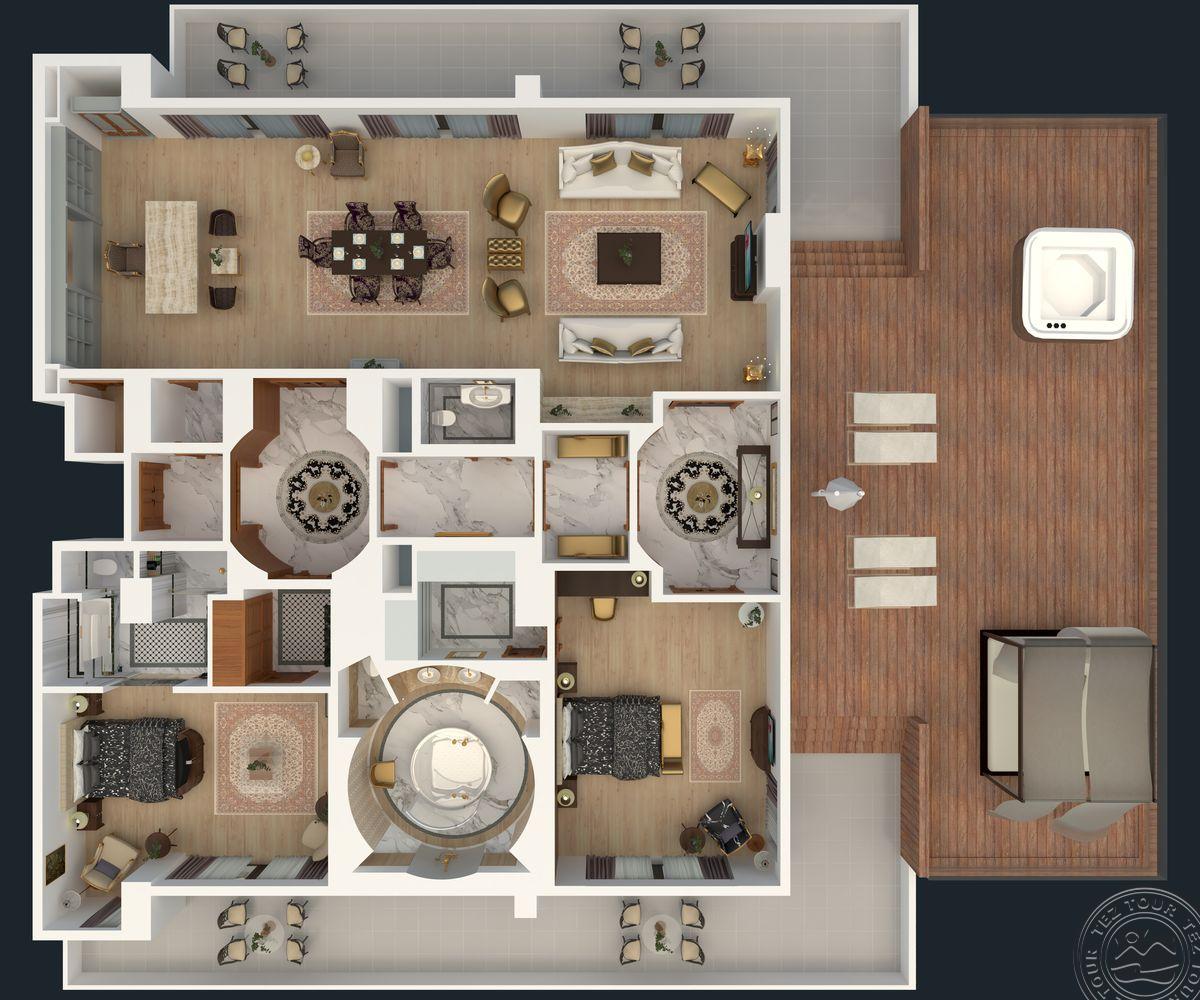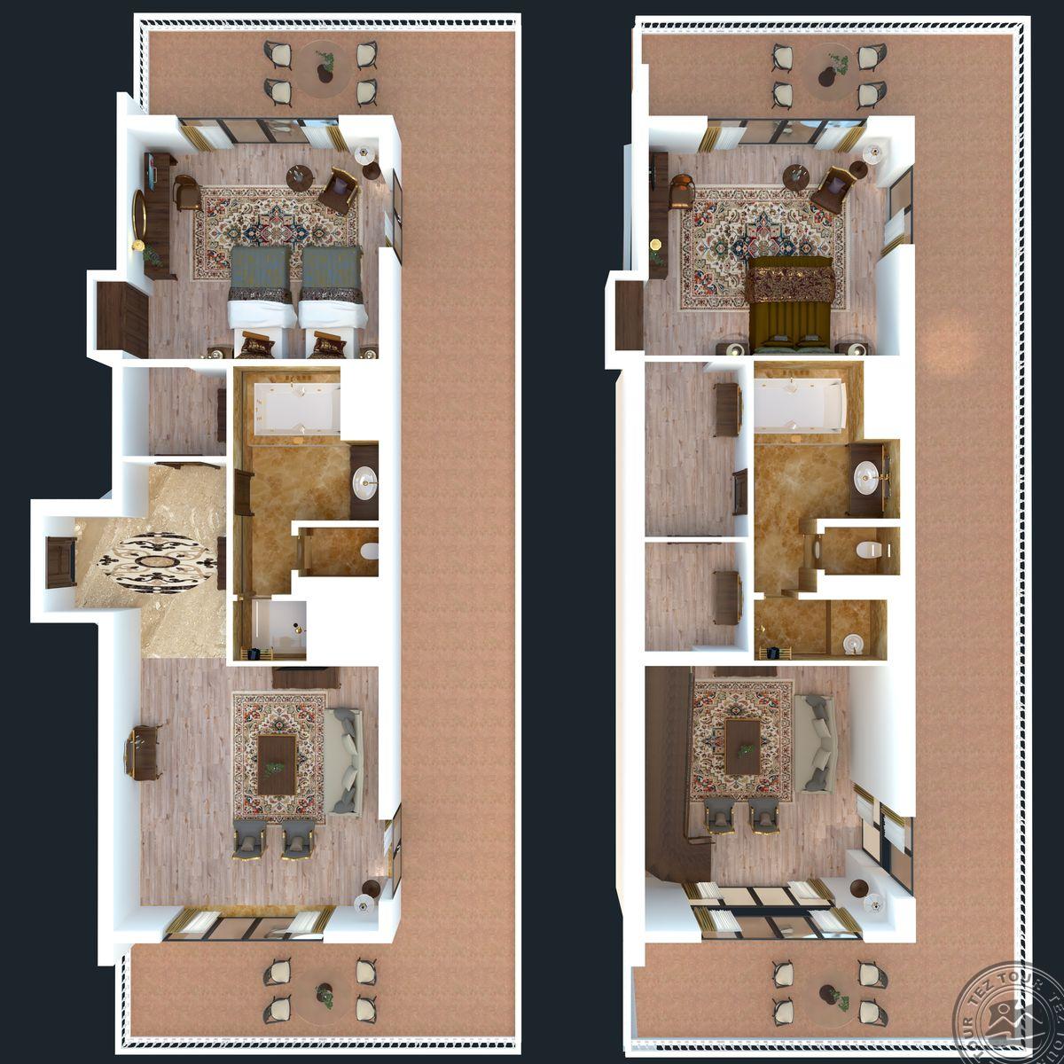 Royal duplex suite (на верхнем этаже спальня, джакузи; на нижнем этаже – спальня, гостиная, терраса c шезлонгами, павильоном и джакузи; макс. 5+инф, 145 м2);