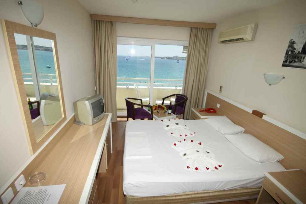 Особенности отеля.:Отель с частным пляжем. В ресторане отеля Tuntas Hotel Didim предлагается завтрак, второй завтрак и обед. На территории отеля работает бар у бассейна. Отель ежедневно предоставляет бесплатный завтрак (шведский стол) в ресторан. В отеле имеются места отдыха и развлечений: открытый бассейн, детский бассейн и фитнес-центр. Отель предоставляет следующие услуги: конференц-залы (для небольших групп) и прокат лимузинов. Бесплатный беспроводной доступ в Интернет в зонах общественного пользования. В отеле имеется площадь для проведения мероприятий; предлагается следующее: помощь в организации банкетов и банкетный зал. В отеле бесплатно предлагается следующее: услуга встречи на вокзале. В отеле предлагаются следующие услуги: услуги по проведению бракосочетаний, услуги консьержа, помощь туристамуслуги по бронированию билетов и помощь туристам. Предусмотрена бесплатная парковка для гостей. Дополнительные услуги этого отеля в стиле "ар деко" включают: терраса на крыше, библиотека и многоязычный персонал.; **Номера. **; В кондиционируемых номерах отеля Tuntas Hotel Didim есть минибар и сейфы. Имеются меблированные балконы, откуда открывается вид на пляж, море или океан (частично). Постельные принадлежности включают: пружинный ортопедический матрас, а также перьевое одеяло. В ванных комнатах предлагается следующее: ванные или душевые и ручной душ. Также в ванных комнатах есть купальный халат и фен. В номерах предоставляются стол и телефон с прямым набором номера. В каждом номере есть телевизор. Предлагается следующее: спутниковые каналы и бесплатные киноканалы. Также предоставляются следующие удобства: открывающиеся окна и приветственные подарки. По запросу предоставляется: утюг, гладильная доска и услуга пробуждения по телефону. Обслуживание номеров выполняется ежедневно.