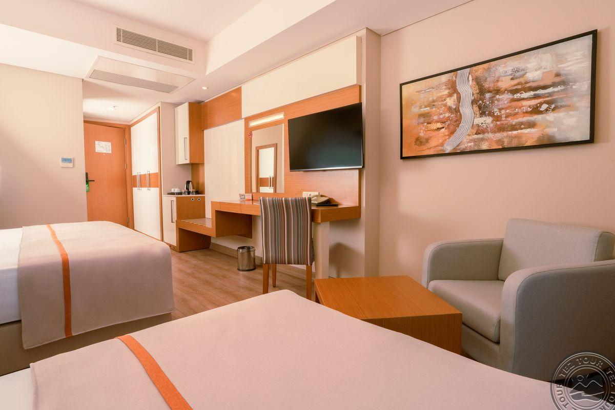 Номер:> сейф: в номере, бесплатно уборка номера: ежедневно смена белья: 2 раза в неделю пол: ковровое покрытие телевизор: есть (русский канал) балкон душ фен: есть кондиционер: центральный мини-бар бесплатно (вода ежедневно) room service: круглосуточно телефон