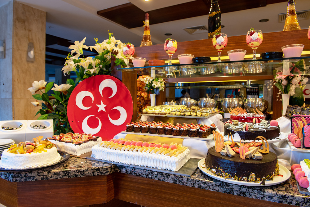 - Система питанияЗавтрак (с 07:30 до 10:30) - шведский стол, ГлавныйОбед (с 12:30 до 14:00) - шведский стол, ГлавныйУжин (с 19:00 до 21:00) - шведский стол, ГлавныйПицца, гезлеме, пиде (с 14.00 до 16.00) - шведский стол, Snack barПолдник (с 17:00 до 18:00) - чай с пирожными, Snack barВ концепцию включены: местные алкогольные и безалкогольные напитки, кофе / чай, фруктовые соки, пирожные во время полдника.Платно: вся еда и напитки после 23:00, вся еда и напитки на пляже, напитки импортные и в бутылках, свежевыжатые соки, мороженое, все напитки в ресторане Via Veneto, турецкий мокко, эспрессо, капучино