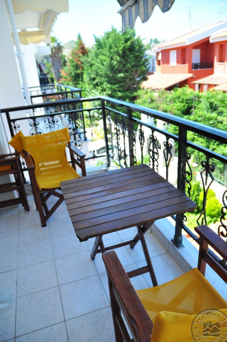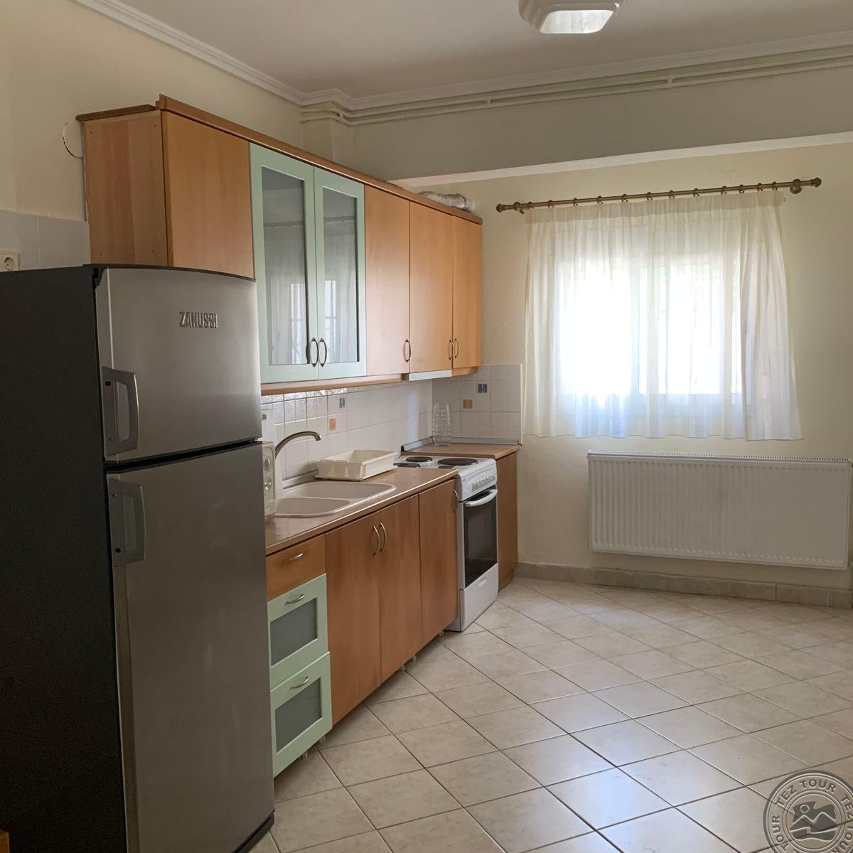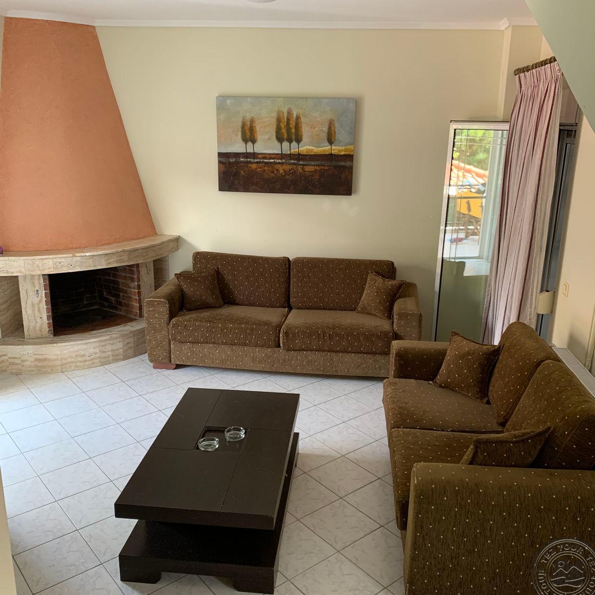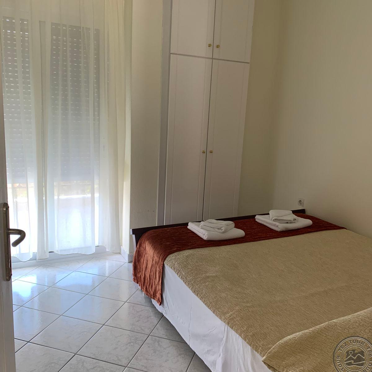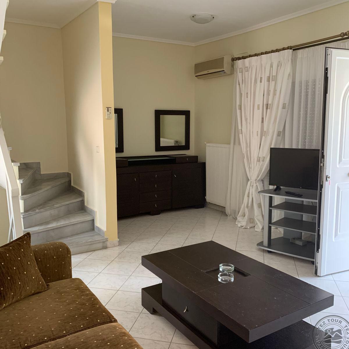 на п-ве Кассандра, в 100 км от аэропорта г.Салоники, в поселке Пефкохори, в 150 м от пляжа.