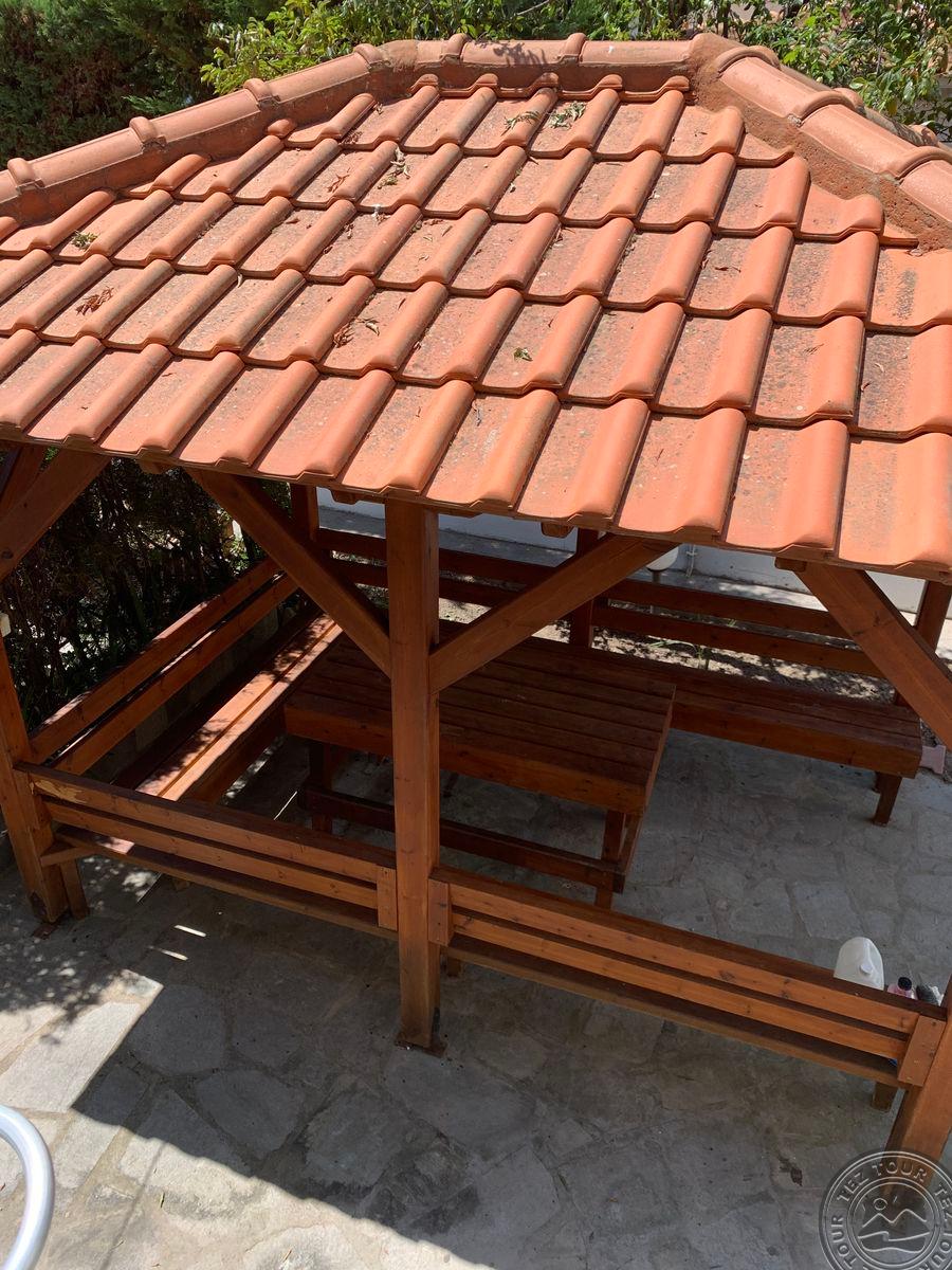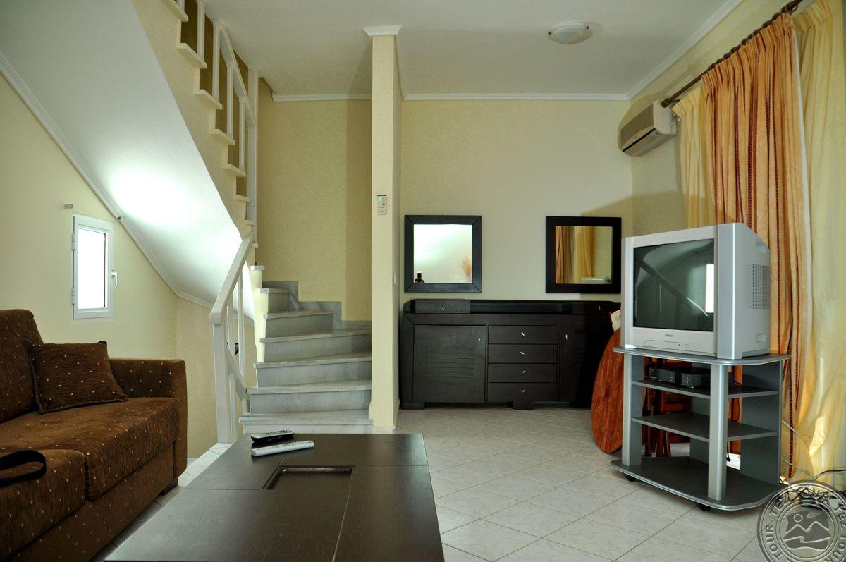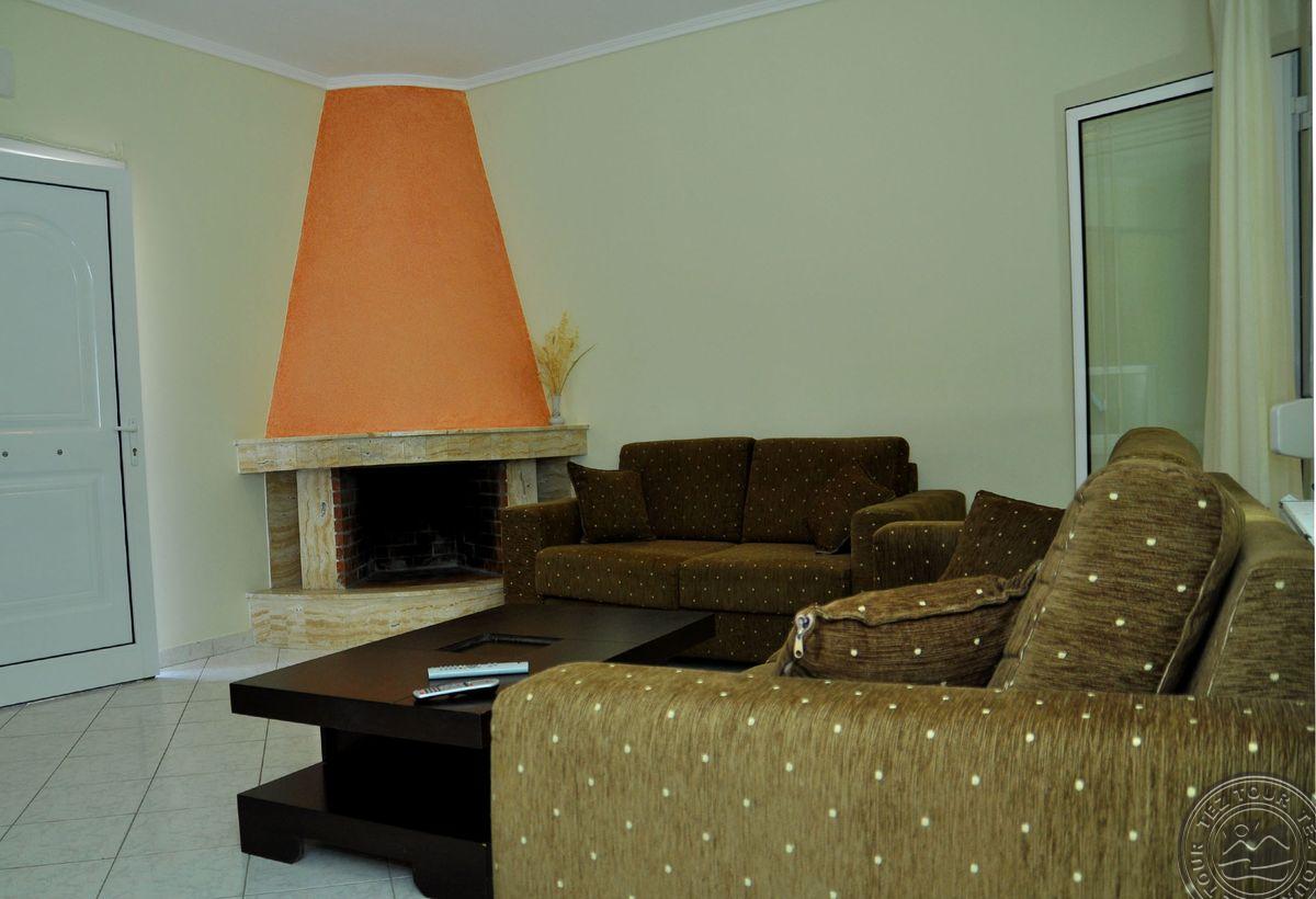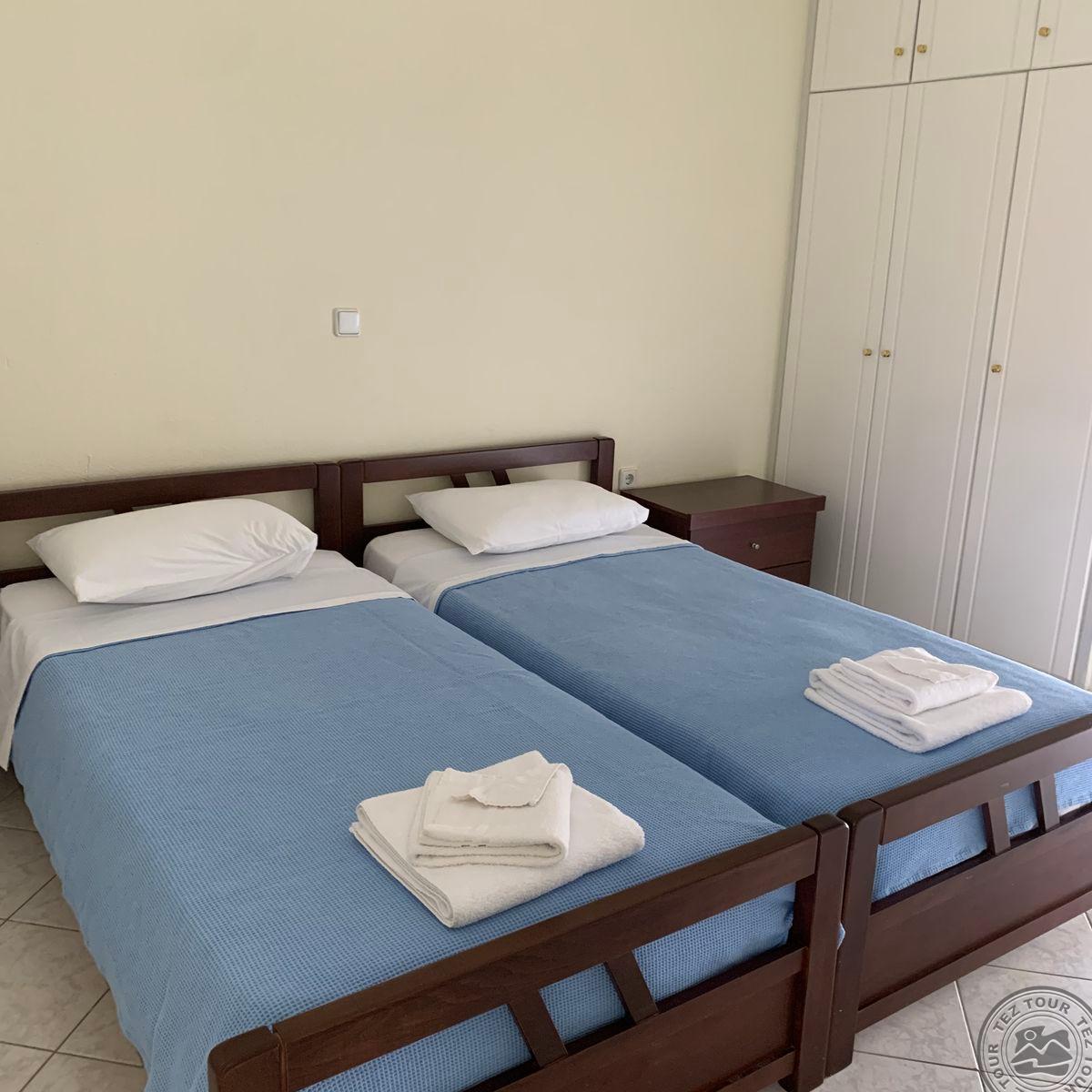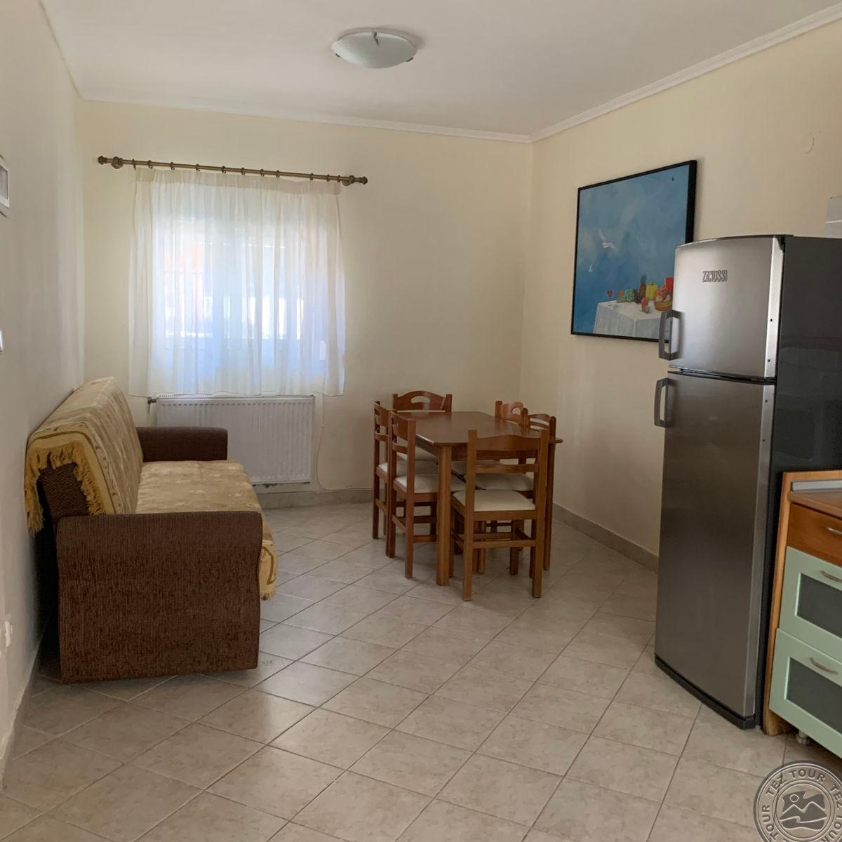 на п-ве Кассандра, в 100 км от аэропорта г.Салоники, в поселке Пефкохори, в 150 м от пляжа.