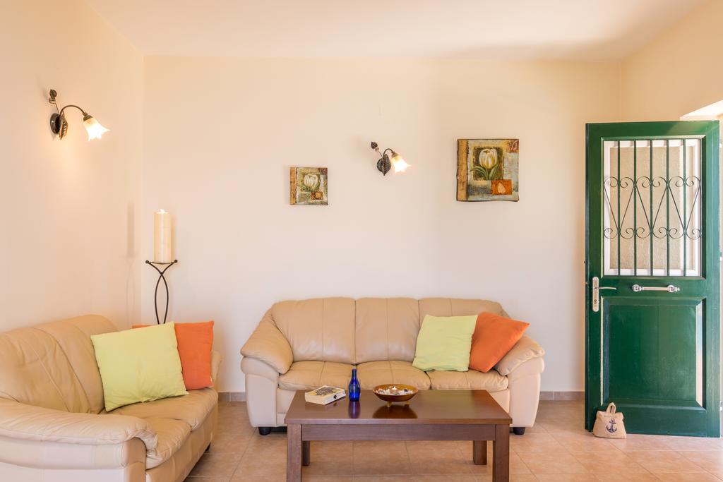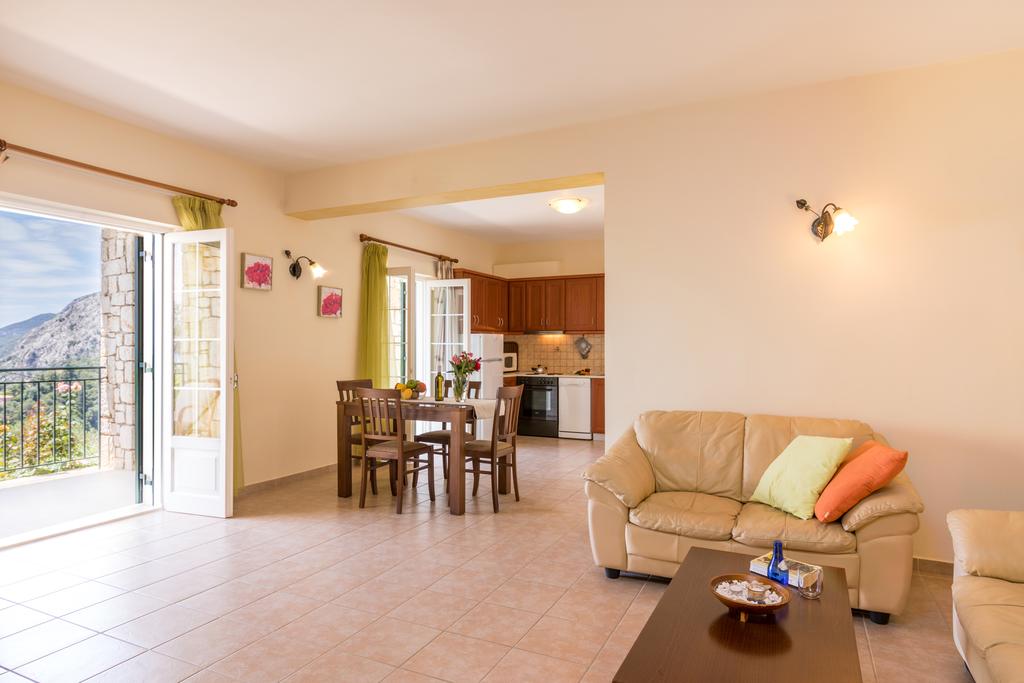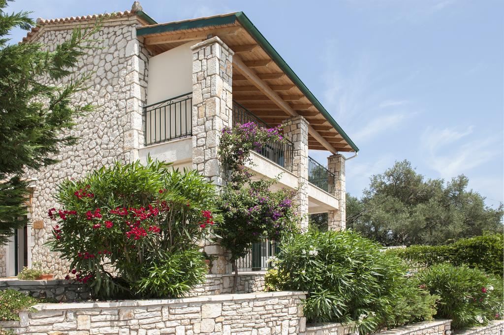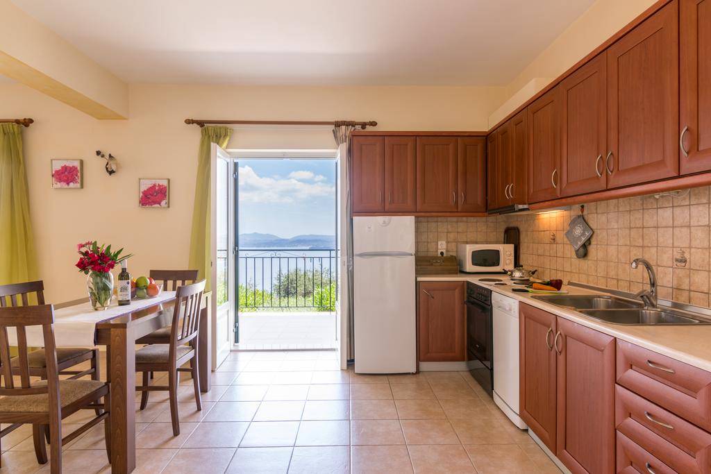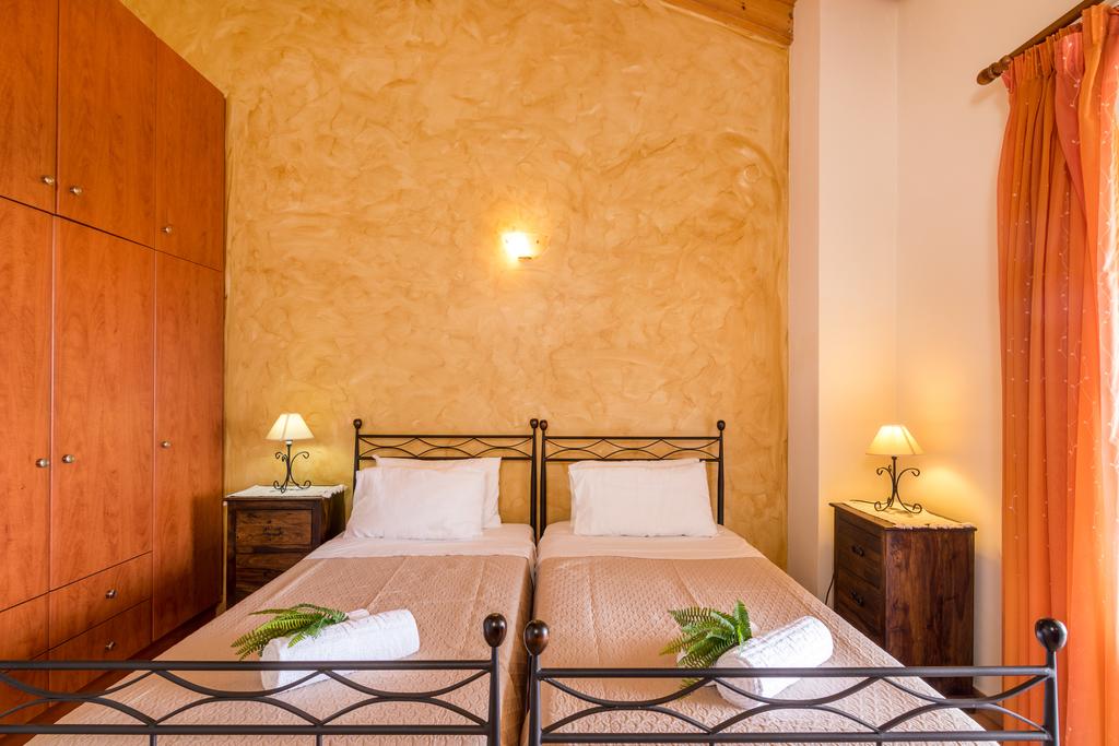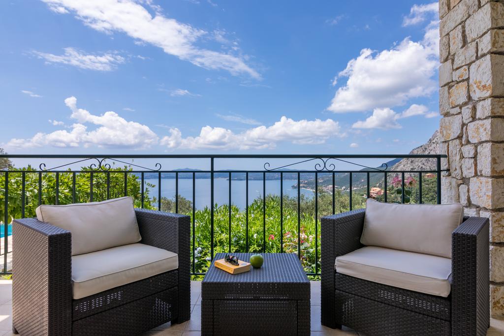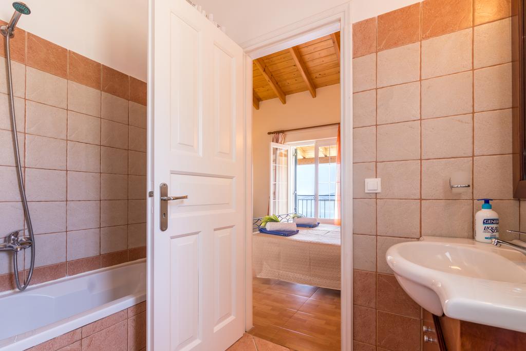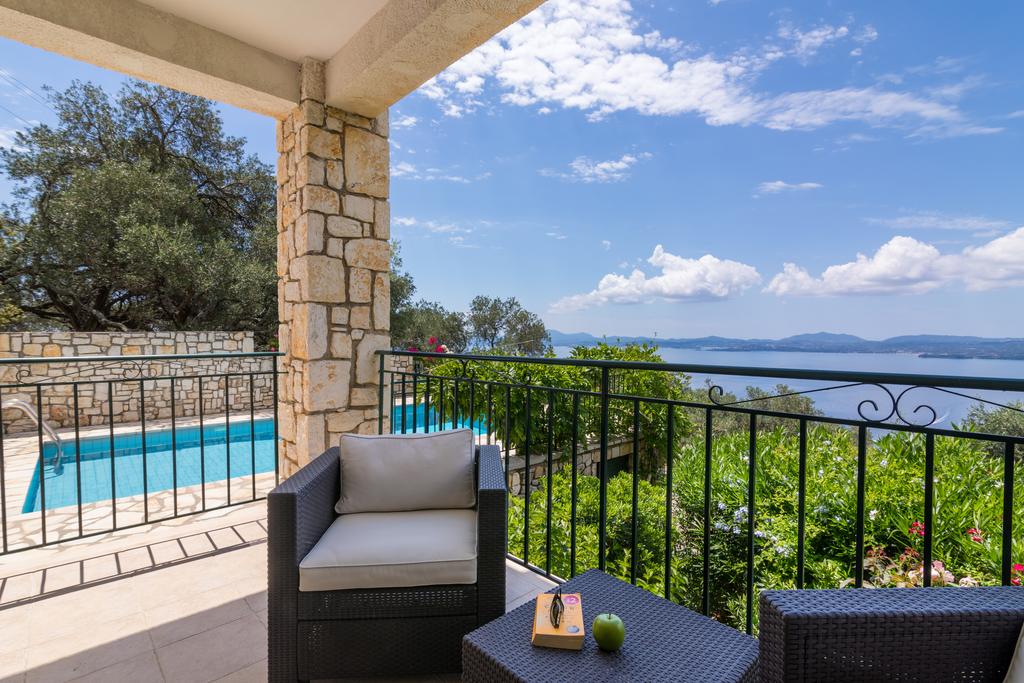 На верхнем этаже есть 1 спальня с двуспальной кроватью и 1 спальня с двумя односпальными кроватями, каждая с собственной ванной комнатой и французскими дверями, которые ведут на балкон, который затенен и меблирован. Панорамный вид с балкона на лазурные воды Ионического моря.