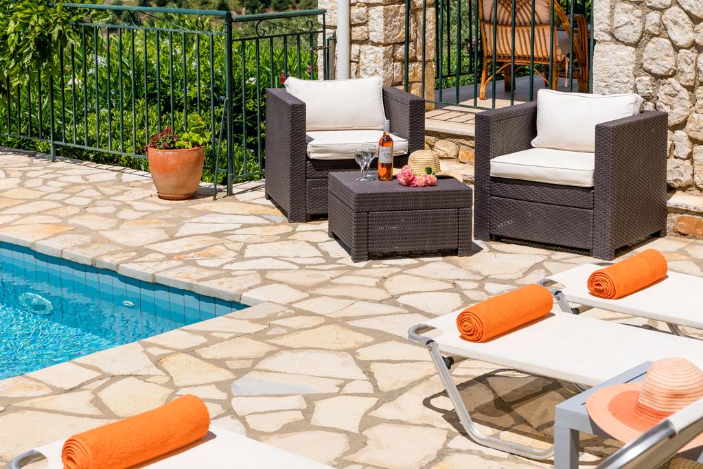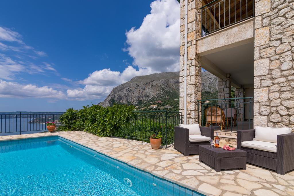 Частный бассейн (7 х 4 м, глубиной 0,8 м - 1,8 м) с зоной отдыха вокруг. Потрясающий вид на восточное побережье, Албанию и город Корфу на юге.