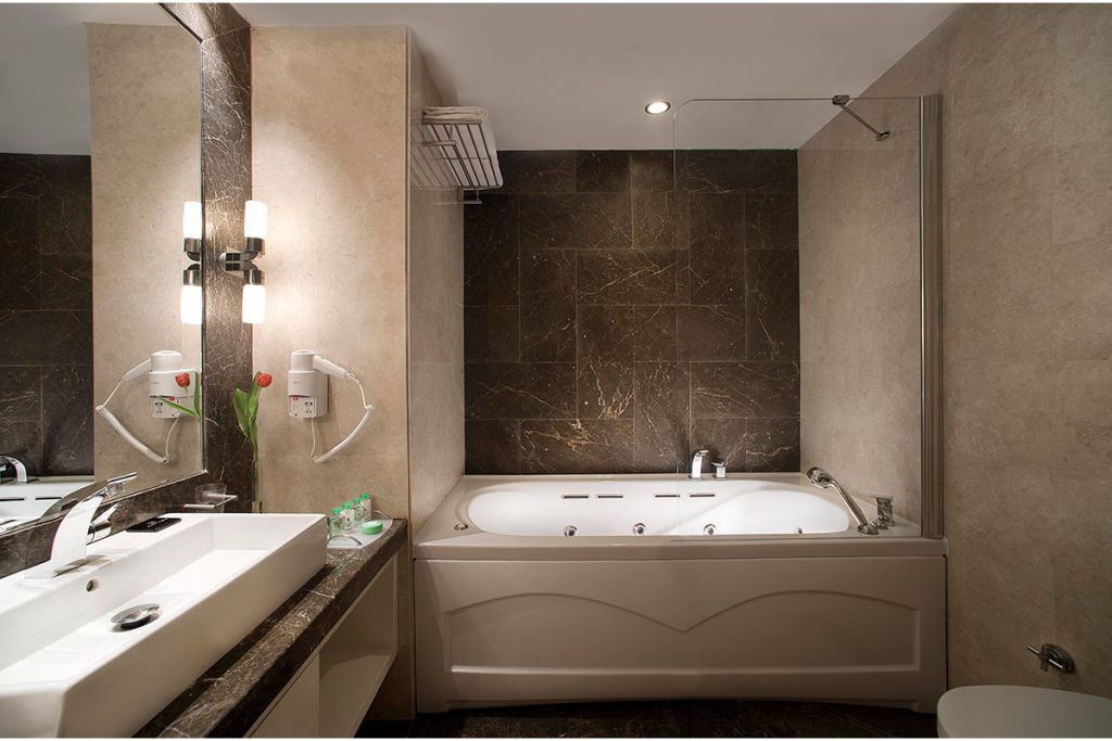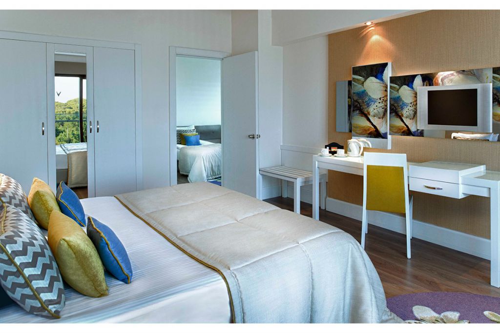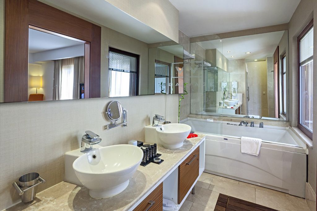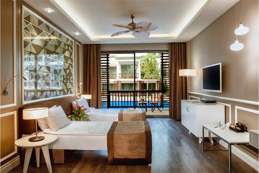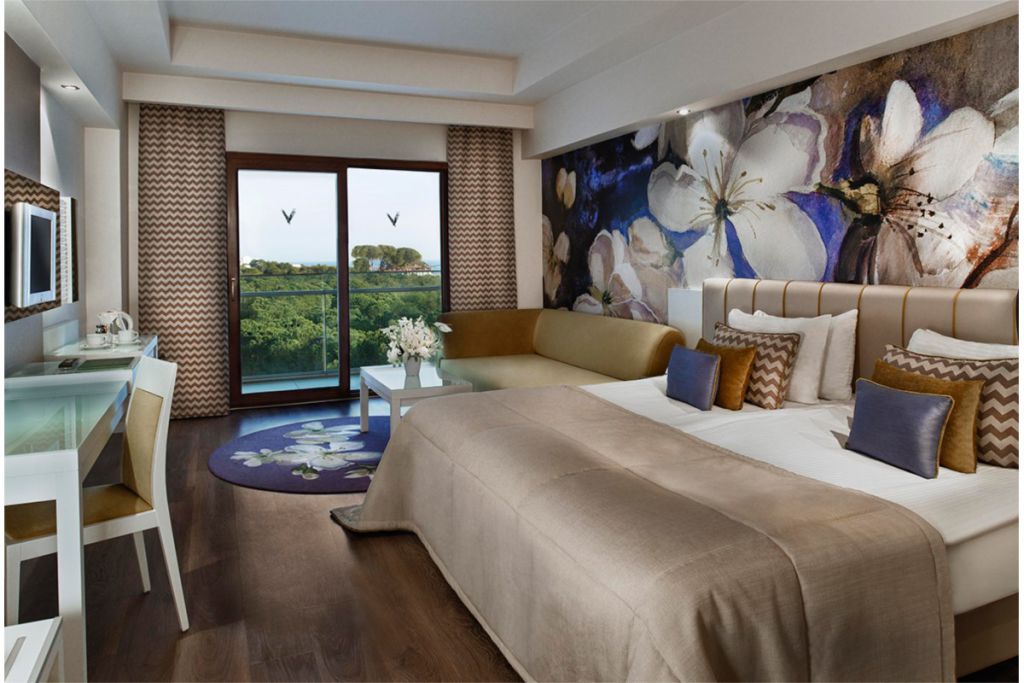 • Main Building Standard Room Side Sea View: 32 кв.м, 1 спальная комната – 1 двуспальная или 2 односпальных кровати, ванная, туалет, балкон 1–3 Взрослых. Сплит-кондиционер, ламинированный пол, мини бар, сейф, телевизор, набор: чай/кофе и электрический чайник, музыкальный канал, телефон, ванная, туалет, халат, тапочки, фен, зеркало, балкон.