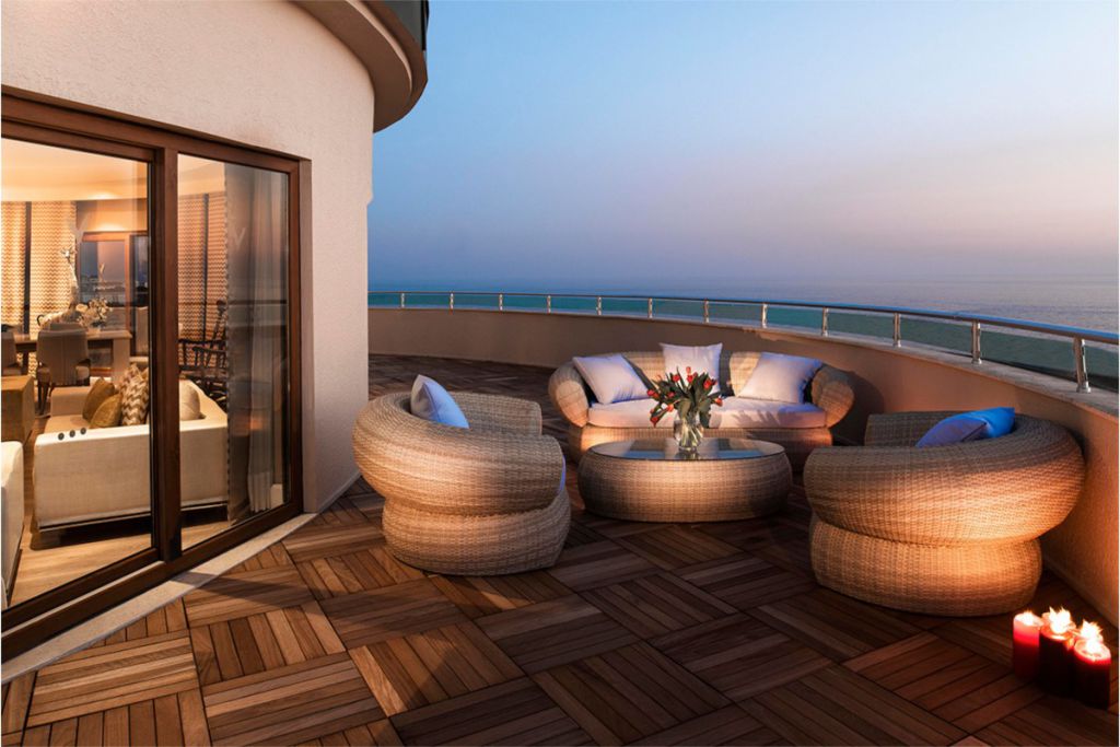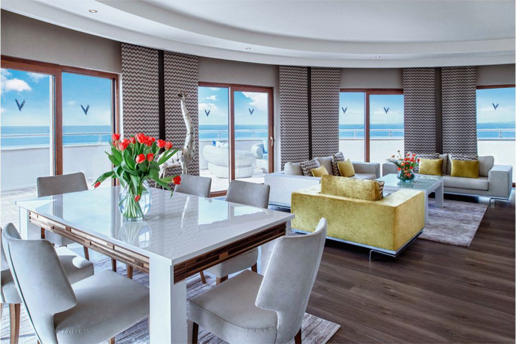 • King Suite: 260 кв.м, 110 кв.м в помещении – 150 кв.м терраса, Основное здание, Прямой вид на море Размещение: 4–6 взрослых. 2 спальных комнаты по 30 кв.м, 1 двуспальная кровать, 2 односпальных кровати, стул, 1 кресло, телевизор (диагональ 105 см), музыкальный канал, DVD и CD плееры, домашний кинотеатр, 1 зал 41 кв.м с набором мягкой мебели и домашним кинотеатром, кондиционер, ламинированный пол, мини бар, сейф, набор: чай, кофе и электрический чайник, телефон, 2 туалета, халат, тапочки, фен, зеркало, 2 гидромассажных ванн и 2 душа, 1 мини-кухня, кухонный стол со стульями, терраса с деревянными полами (1 джакузи, 2 шезлонга, 1 пляжный зонт, гамак, стол и 2 стула на каждой террасе).