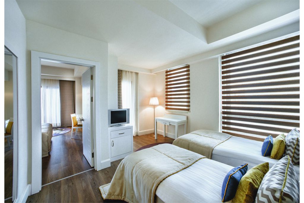 • A Block Family Room: вид на сад, 39,5 кв.м, 2 спальных комнаты – 1 двуспальная и 2 односпальных кровати, ванная, туалет, балкон 2–4 Взрослых. Сплит кондиционер, ламинированный пол, мини бар, сейф, телевизор, набор: чай/кофе и электрический чайник, музыкальный канал, карточная система,5 каналов с мультфильмами, телефон, ванная, туалет, халат, тапочки, фен, зеркало, балкон.