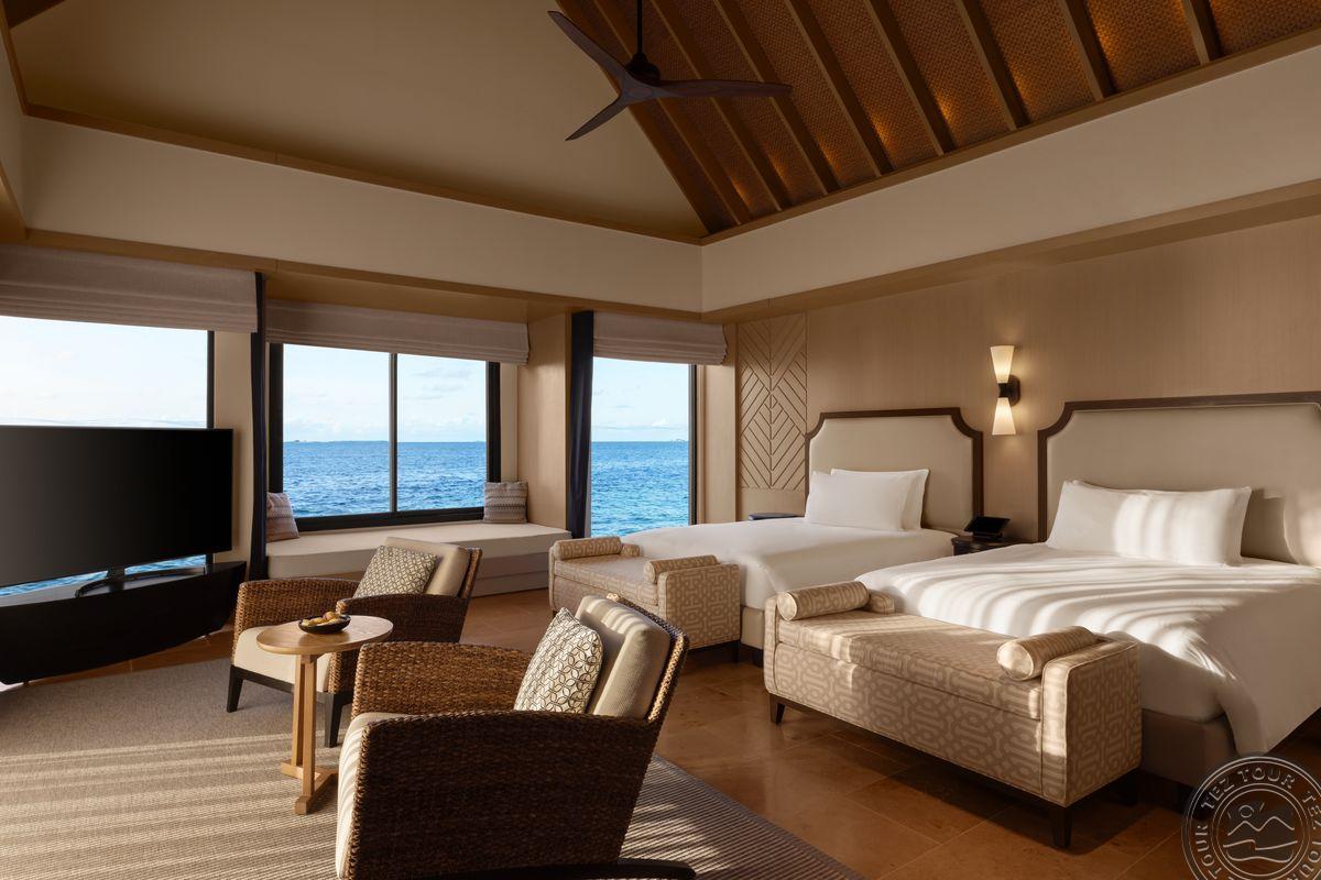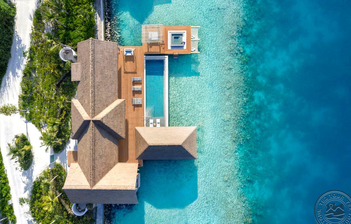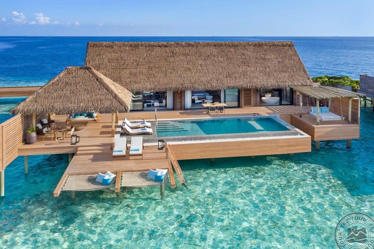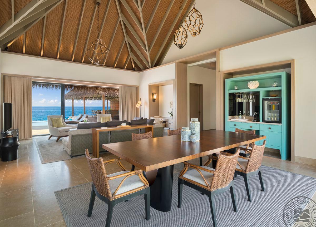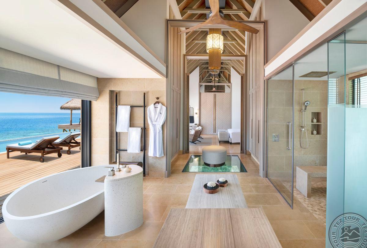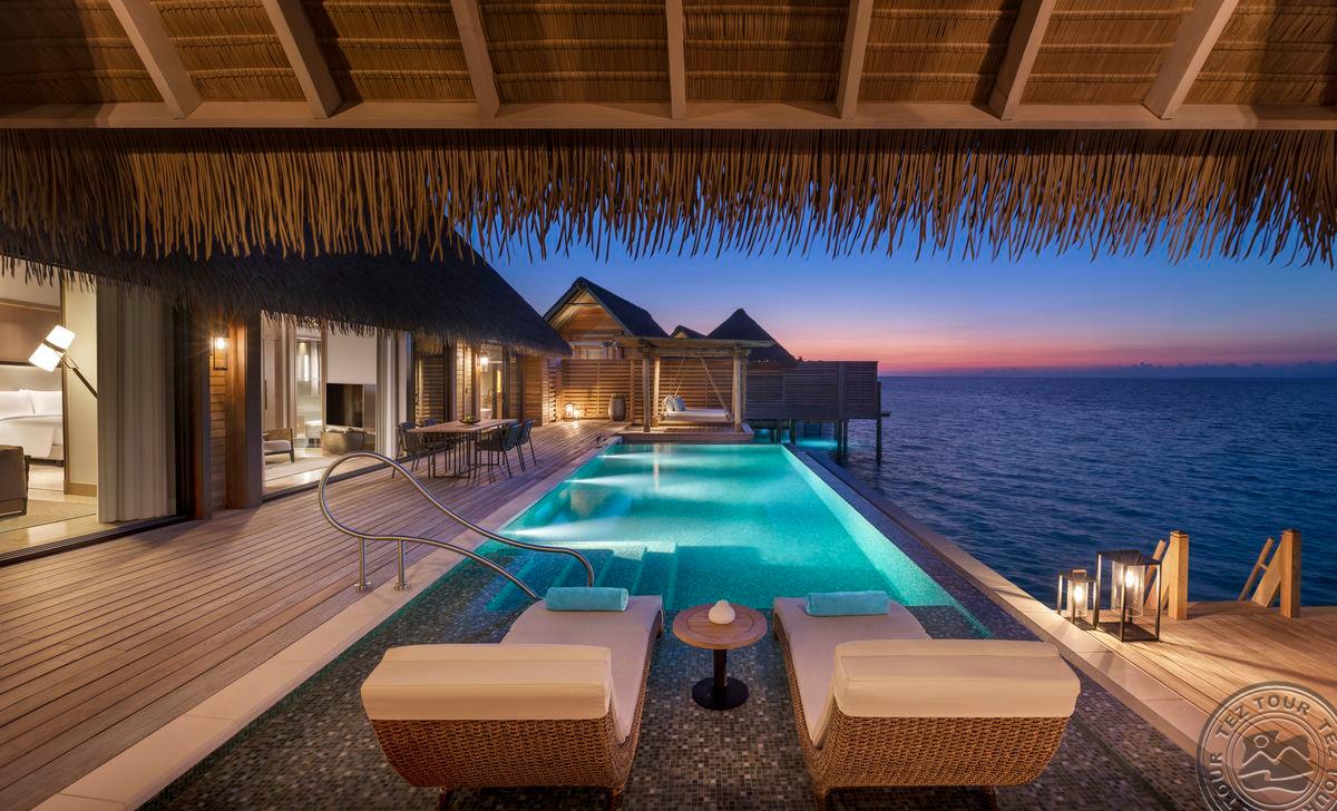 1 вилла 3 Bedroom Overwater Villa with Pool (1113 м2; макс. 7 или 6+2 чел.). Водная вилла с тремя спальнями (две с кроватями king-size; одна – с раздельными twin/ третья спальня расположена отдельно от всего комплекса), гостиной, обеденной зоной, комнатой для няни. Терраса с обеденной зоной и зоной для отдыха, два частных бассейна (10x4 и 15x4), джакузи, надводный гамак, прямой спуск к рифу.