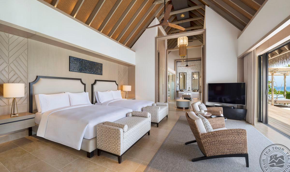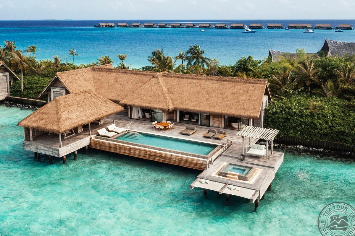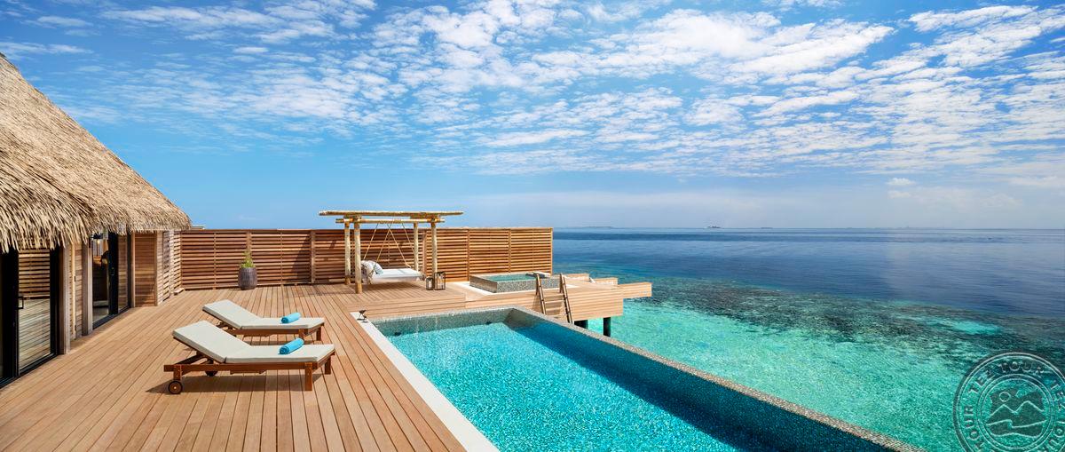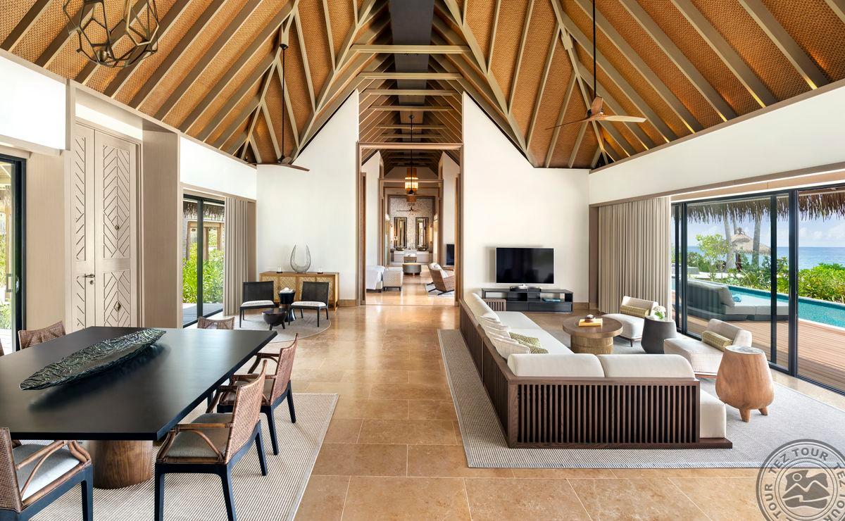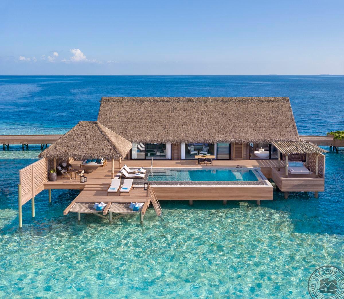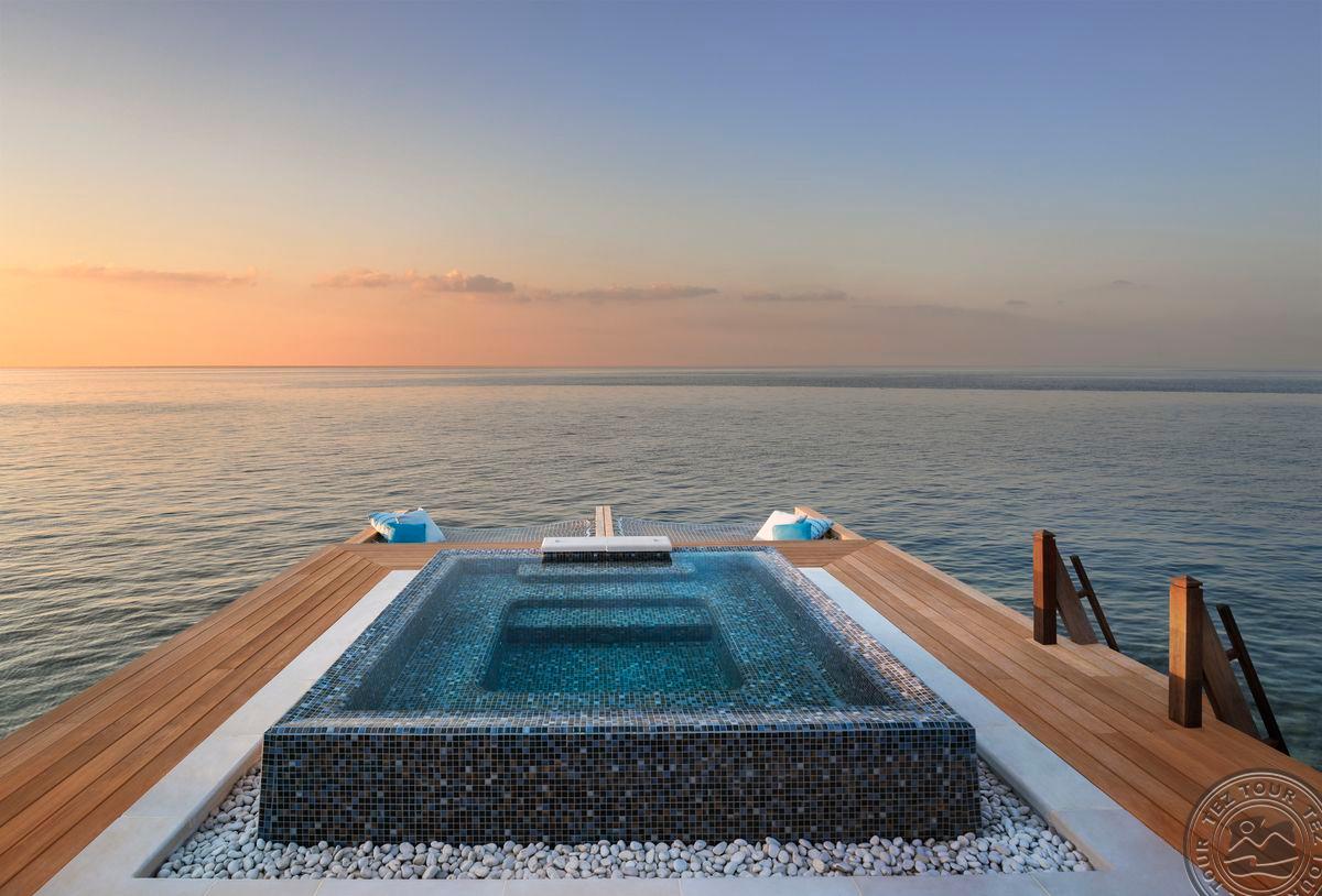 1 вилла 3 Bedroom Overwater Villa with Pool (1113 м2; макс. 7 или 6+2 чел.). Водная вилла с тремя спальнями (две с кроватями king-size; одна – с раздельными twin/ третья спальня расположена отдельно от всего комплекса), гостиной, обеденной зоной, комнатой для няни. Терраса с обеденной зоной и зоной для отдыха, два частных бассейна (10x4 и 15x4), джакузи, надводный гамак, прямой спуск к рифу.