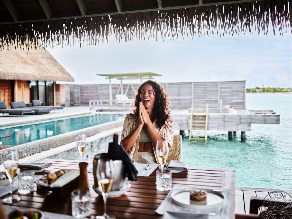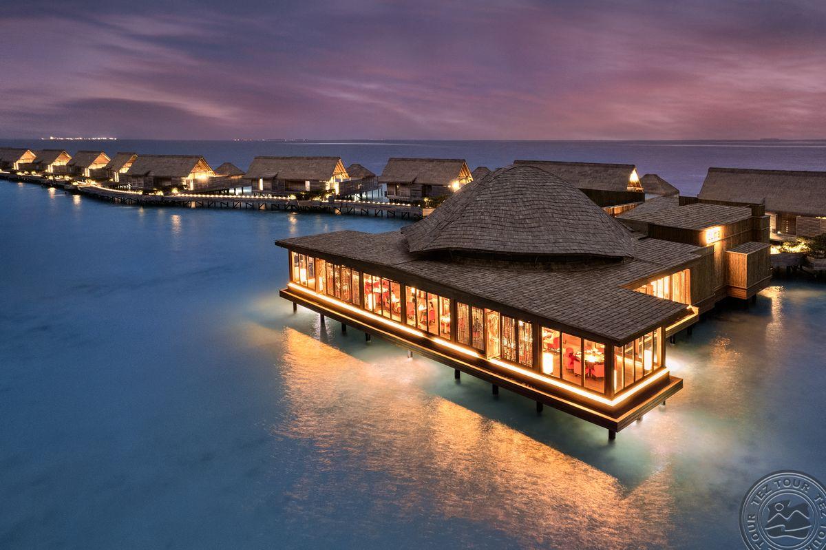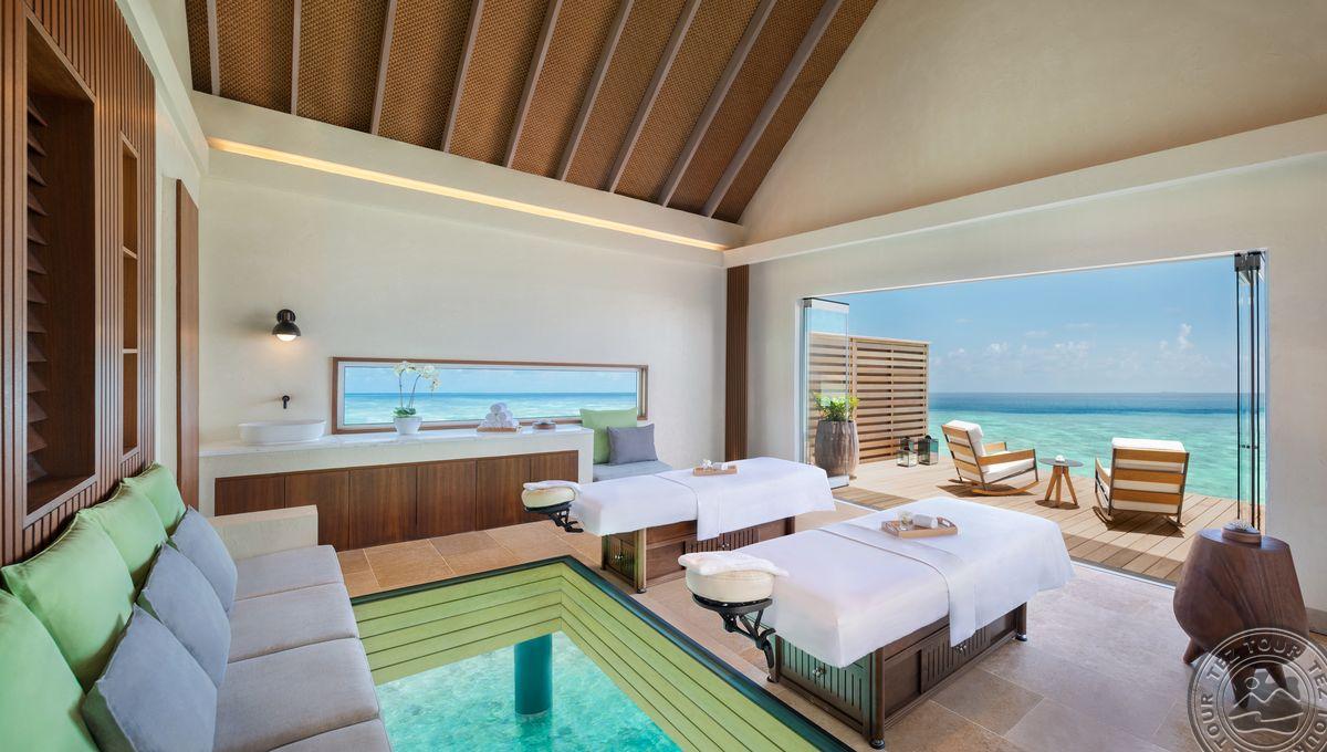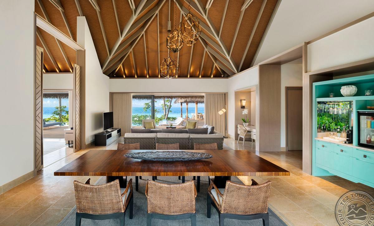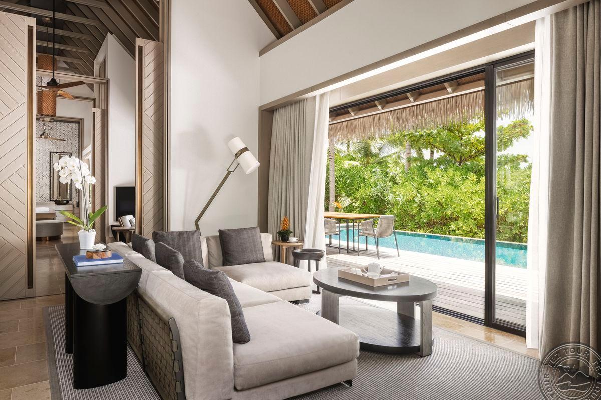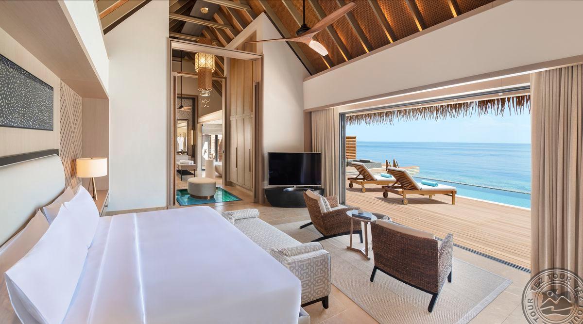 1 вилла 3 Bedroom Overwater Villa with Pool (1113 м2; макс. 7 или 6+2 чел.). Водная вилла с тремя спальнями (две с кроватями king-size; одна – с раздельными twin/ третья спальня расположена отдельно от всего комплекса), гостиной, обеденной зоной, комнатой для няни. Терраса с обеденной зоной и зоной для отдыха, два частных бассейна (10x4 и 15x4), джакузи, надводный гамак, прямой спуск к рифу.