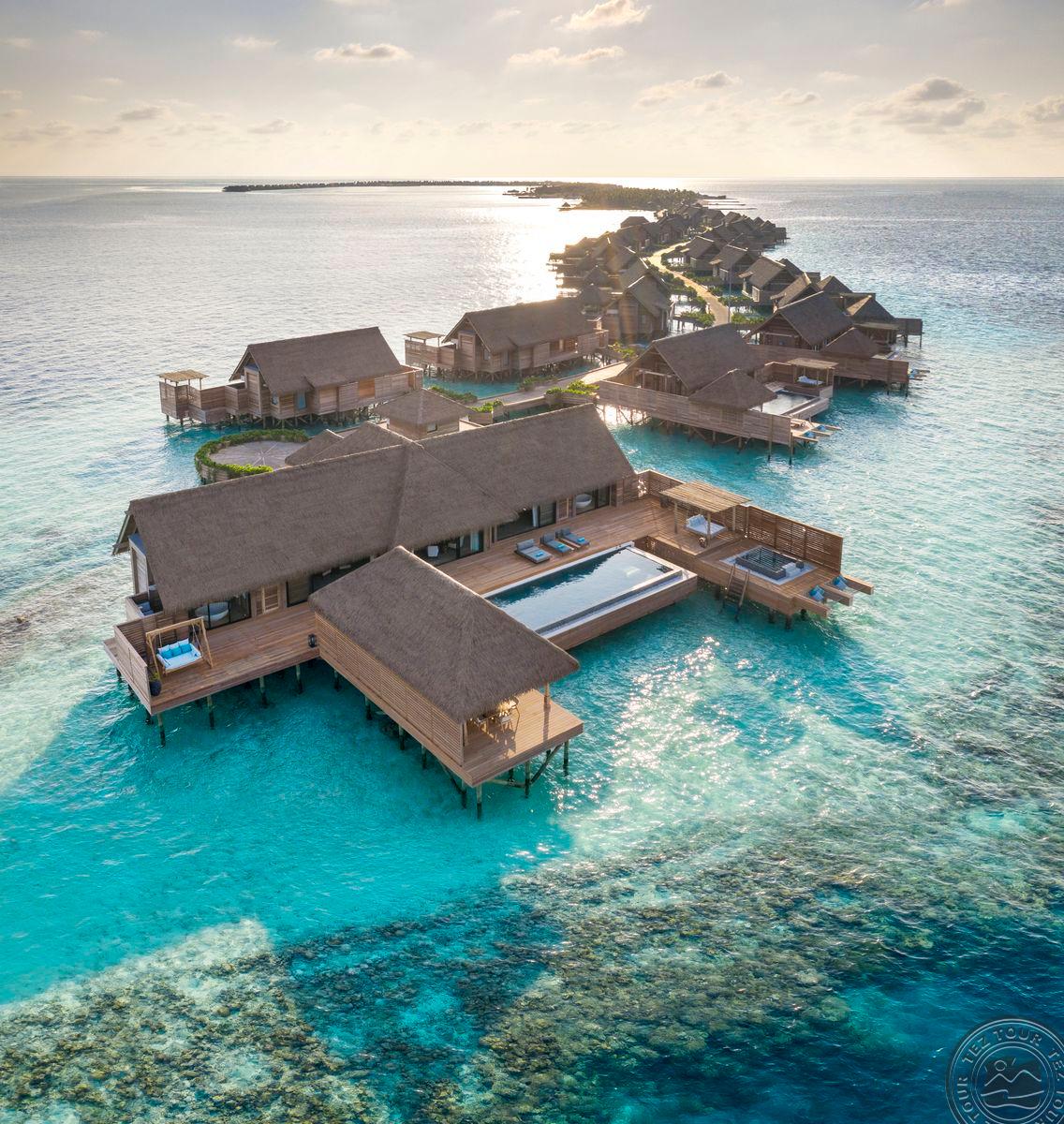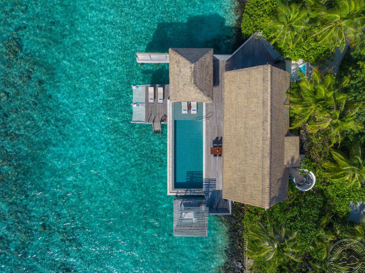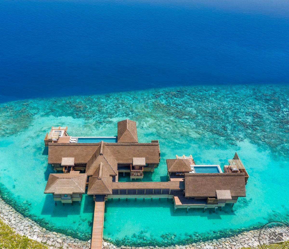 2 виллы 2 Bedroom Reef Villa with Pool (601 м2; макс. 5 или 4+2 чел.). Расположены частично на воде, частично на берегу. Две отдельные спальни (одна с кроватью king-size/ другая, с раздельными twin, расположена отдельно от главной), гостиная, ванная комната. Двухуровневая терраса с частным бассейном (15 х 4 м), джакузи, обеденный павильон, диван-качели, надводный гамак, прямой спуск в воду.
