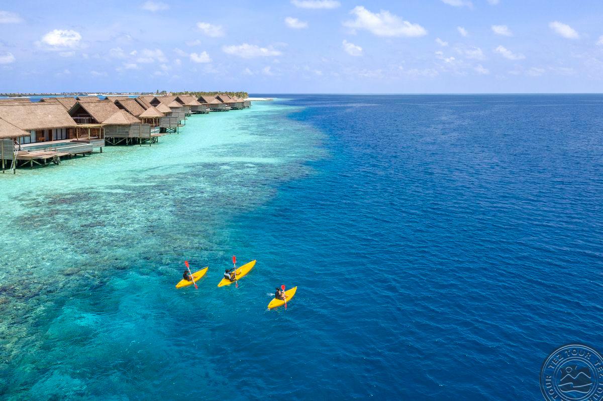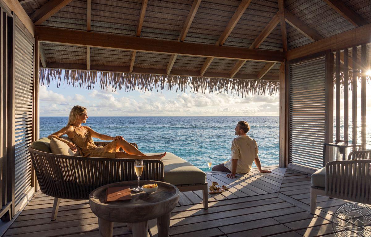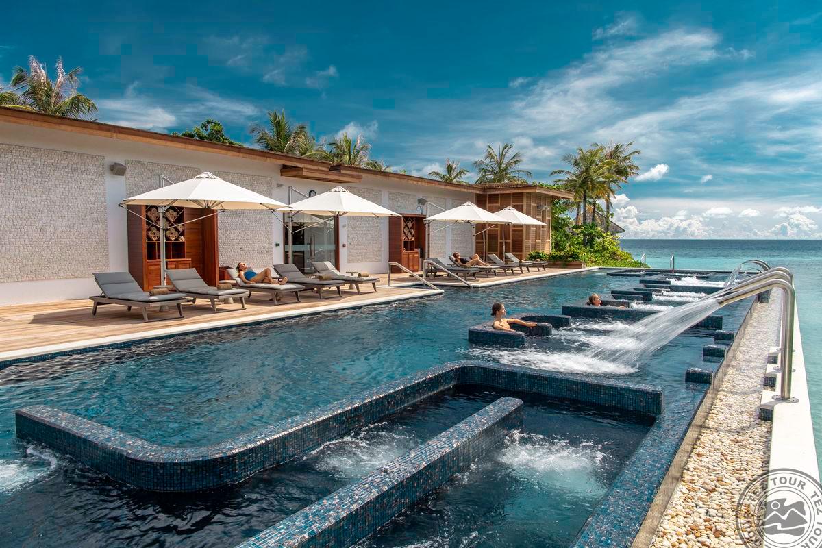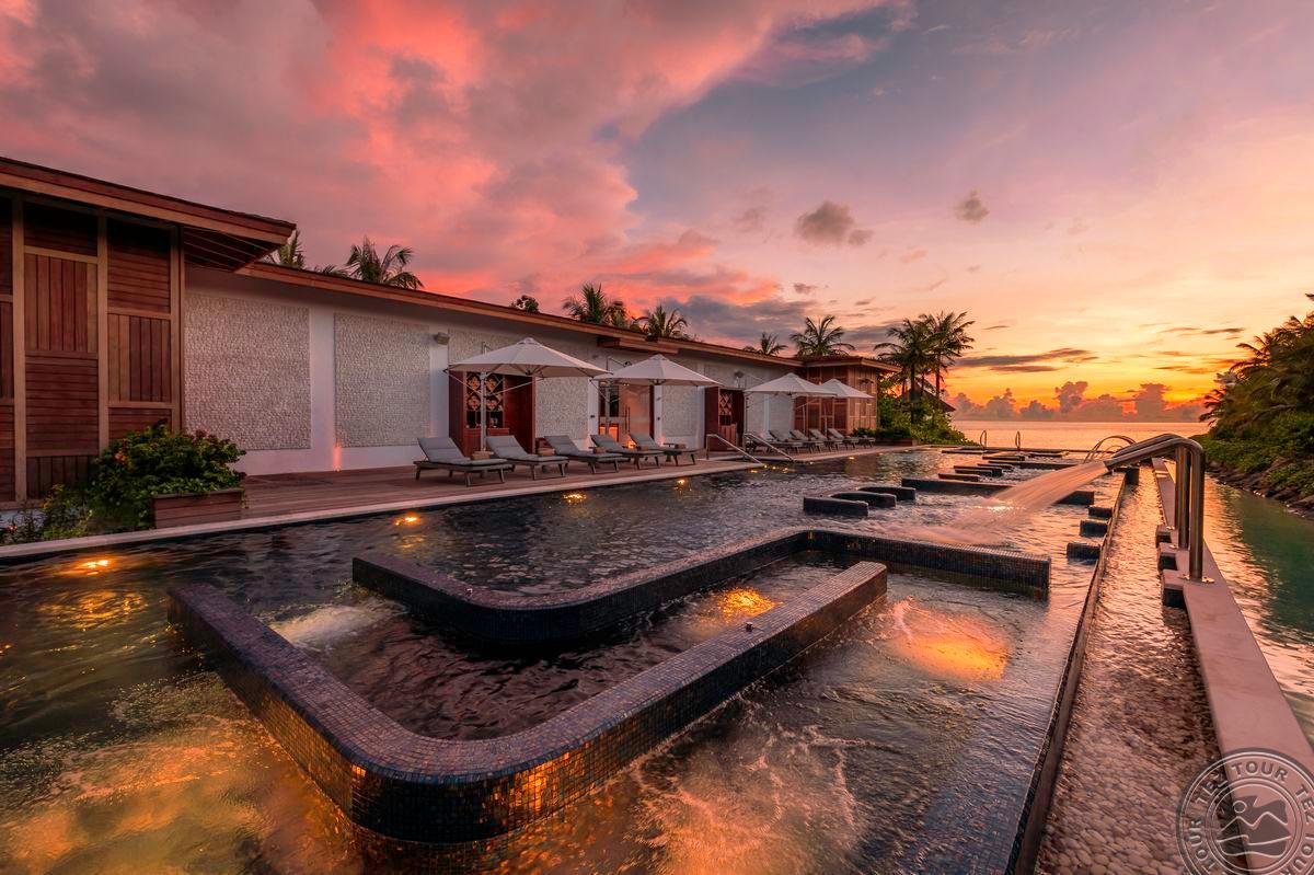2 виллы 2 Bedroom Reef Villa with Pool (601 м2; макс. 5 или 4+2 чел.). Расположены частично на воде, частично на берегу. Две отдельные спальни (одна с кроватью king-size/ другая, с раздельными twin, расположена отдельно от главной), гостиная, ванная комната. Двухуровневая терраса с частным бассейном (15 х 4 м), джакузи, обеденный павильон, диван-качели, надводный гамак, прямой спуск в воду.