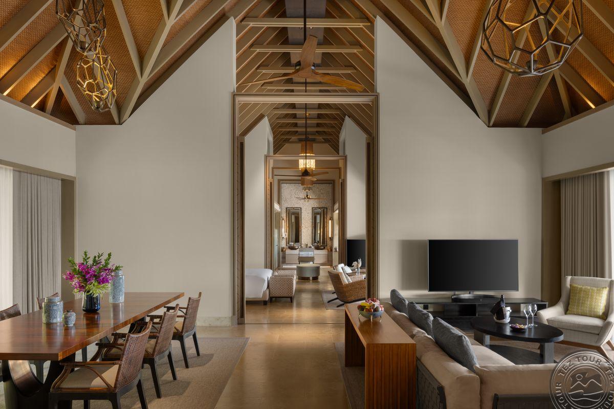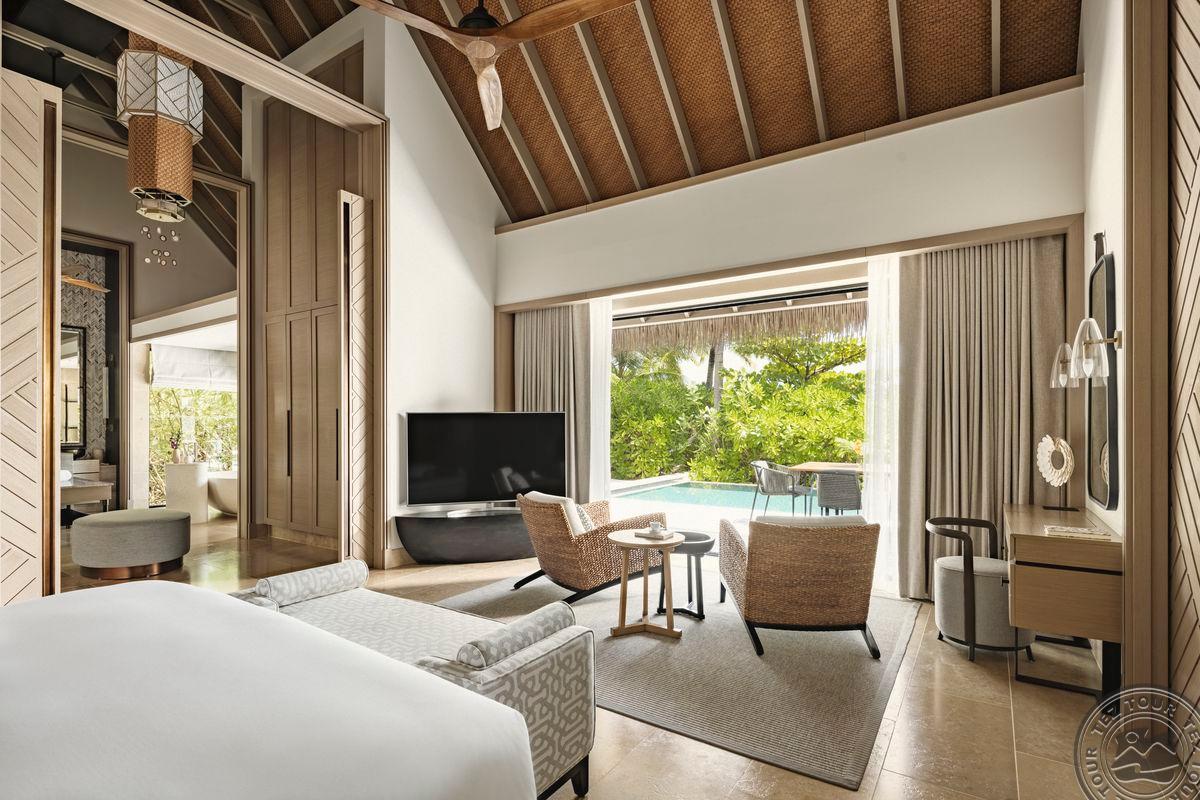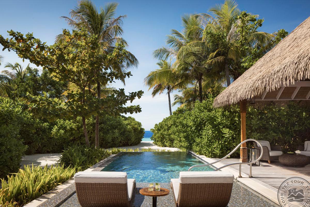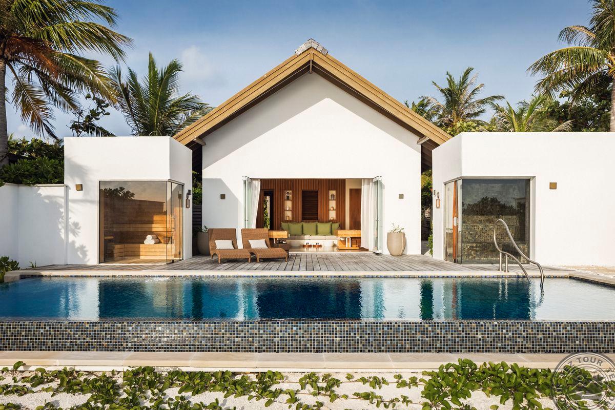 15 Grand Beach Villa with Pool (276-286 м2; макс. 3 или 2+2 чел.). Береговые виллы с прямым выходом на пляж. Спальня с кроватью king-size (3 номера имеют раздельные кровати twin), гостиная, гардеробная, ванная комната с ванной и душем, душ на открытом воздухе. Терраса с частным бассейном (12 х 4 м), обеденный павильон, диван-качели.