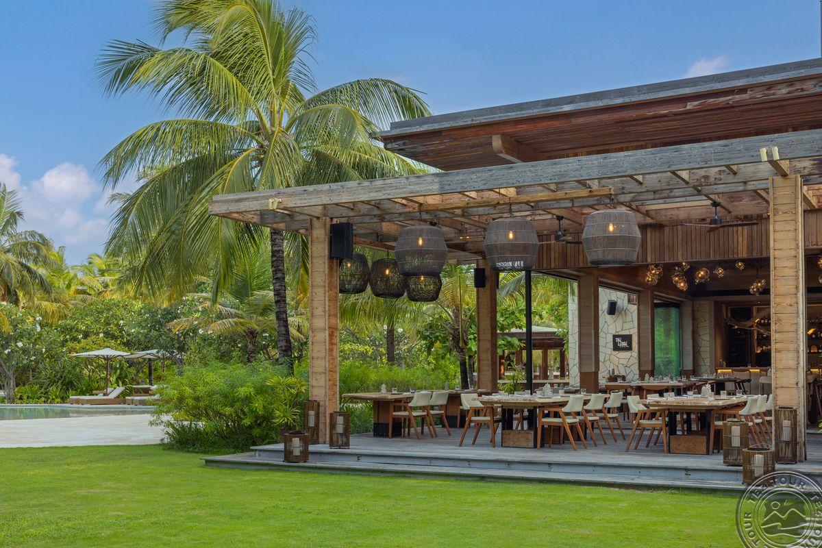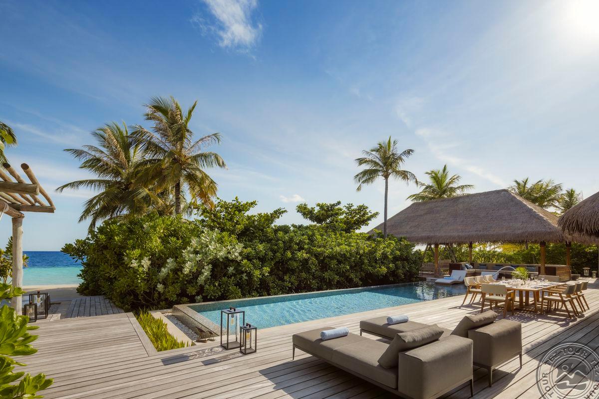 2 виллы 3 Bedroom Grand Beach Villa with Pool (1023 м2; макс. 7 или 6+2 чел.). Береговая вилла с тремя спальнями, расположенными отдельно (две с кроватями king-size; одна – с раздельными twin), гостиной, обеденной зоной. Комната для няни. Терраса с обеденной зоной и зоной для отдыха, два частных бассейна (10x4 и 15x4), джакузи.