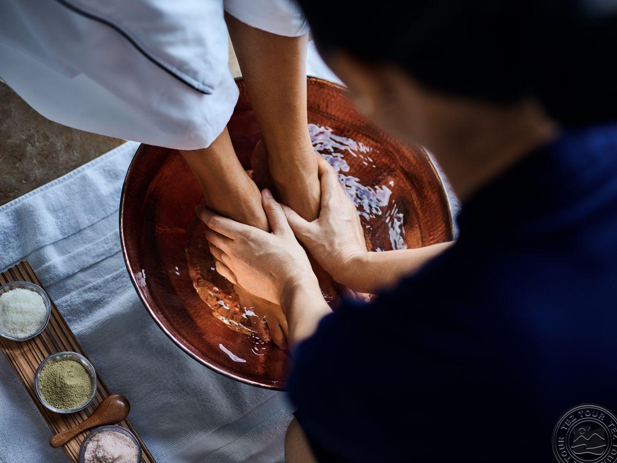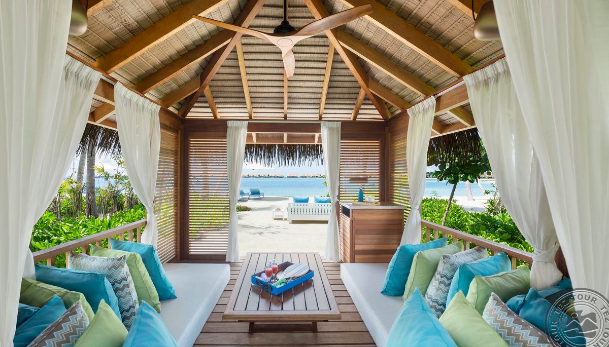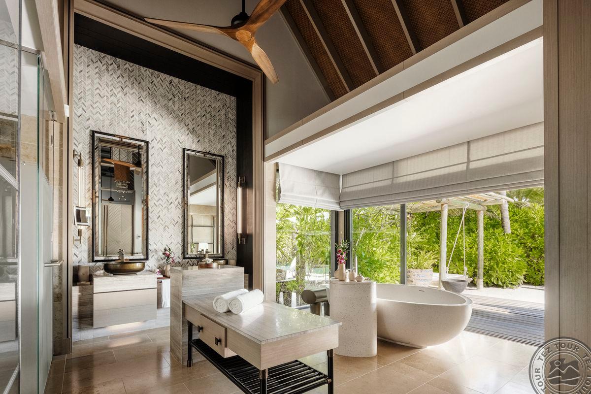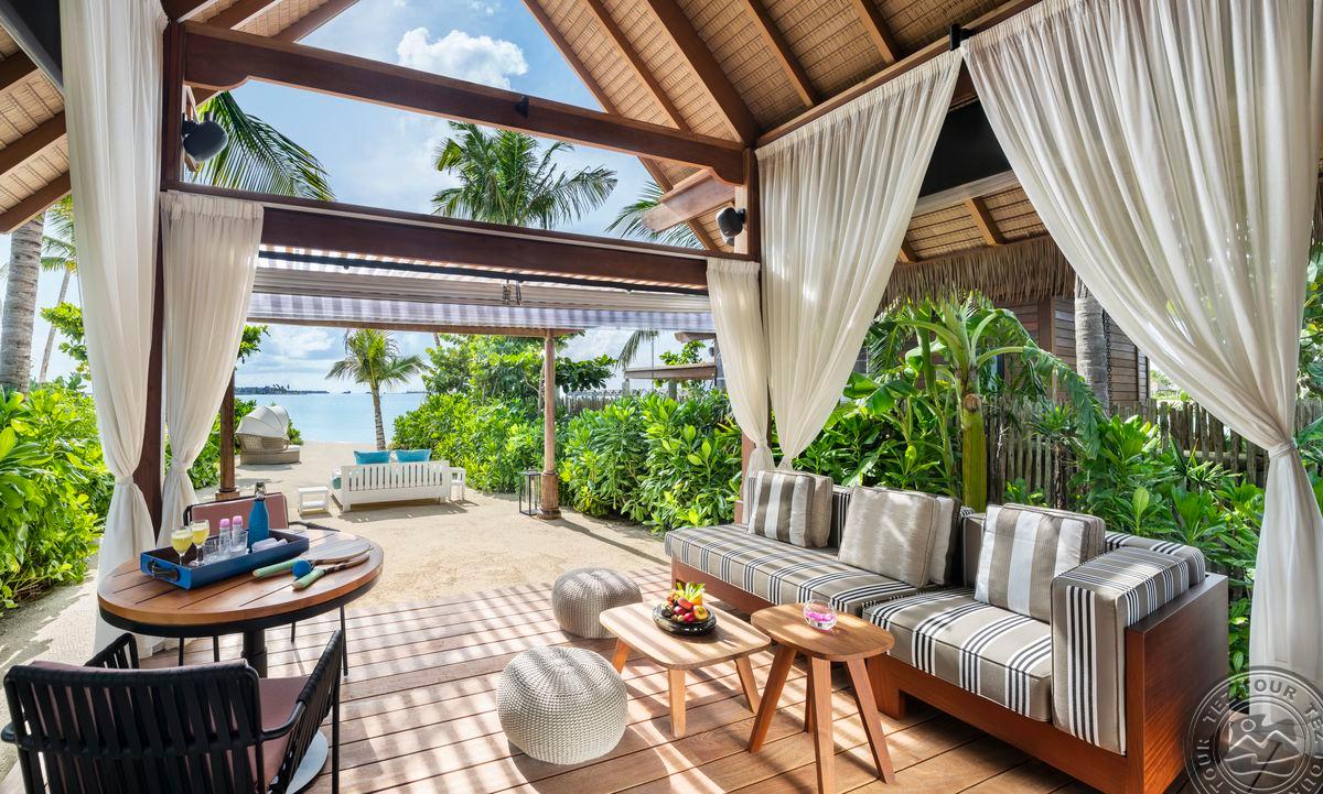 2 виллы 2 Bedroom Grand Beach Villa with Pool (626 м2; макс. 6 чел.). Береговые виллы с двумя отдельными спальнями (одна с кроватью king-size; другая – с раздельными twin), гостиной с обеденной зоной и комнатой для прислуги. В каждой спальне ванная комната. Терраса с частным бассейном (15 х 4 м), джакузи и обеденным павильоном, диван-качели, гамак. Прямой выход на пляж.