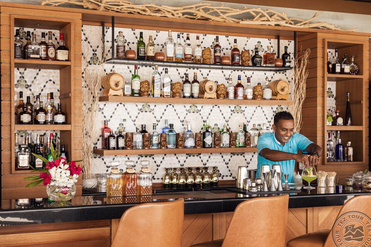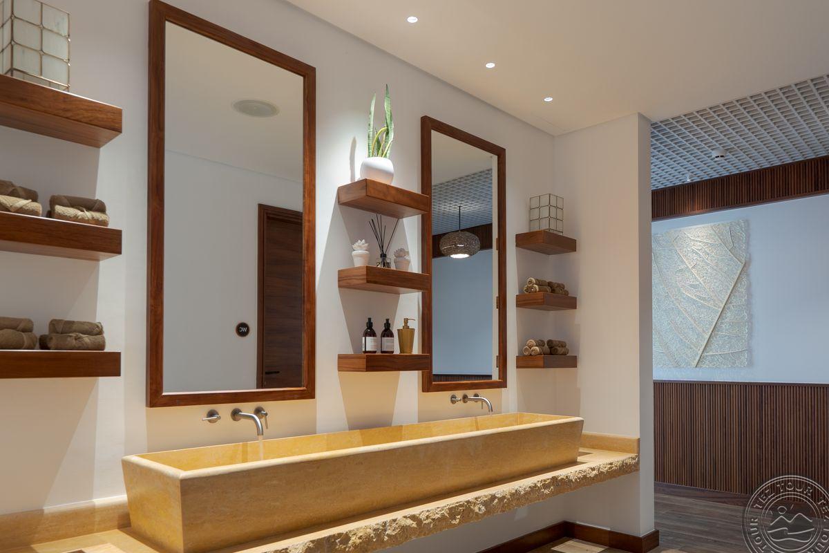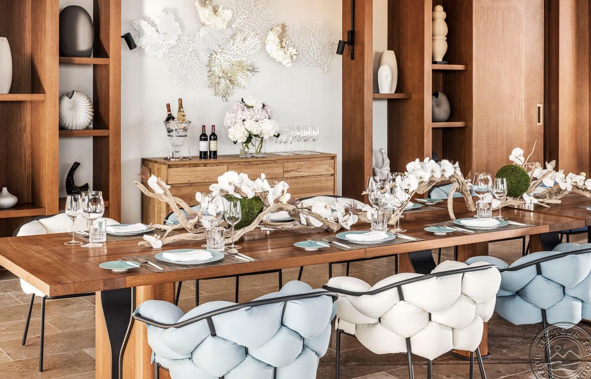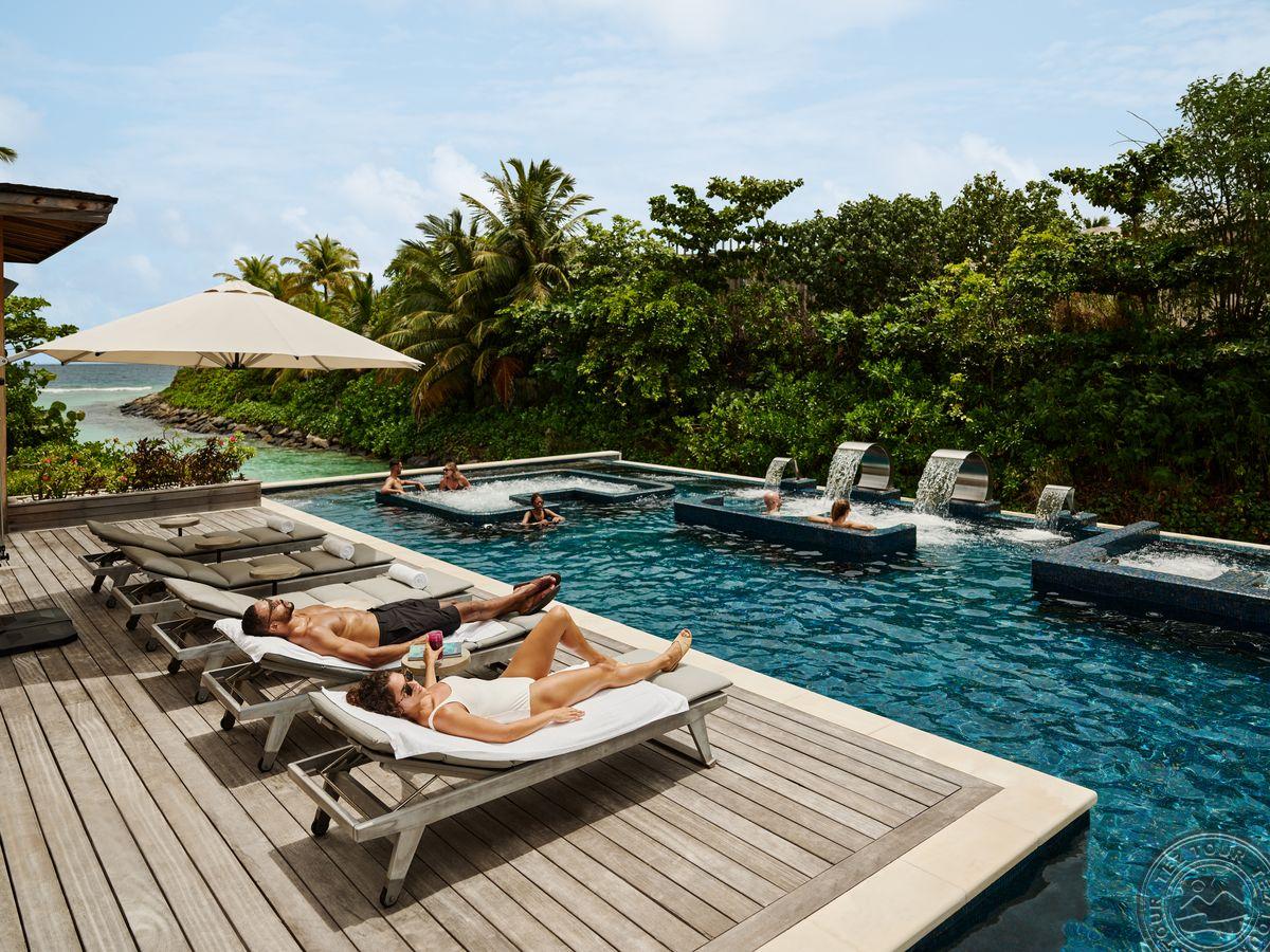 10 Grand Reef Villa with Pool (319-333 м2; макс. 3 или 2+2 чел.). Расположены частично на воде, частично на берегу. Номера идентичны по наполнению категории Reef Villa with Pool, но дополнительно имеют отдельную гостиную. Спальня с кроватью king-size (1 номер имеет раздельные кровати twin).