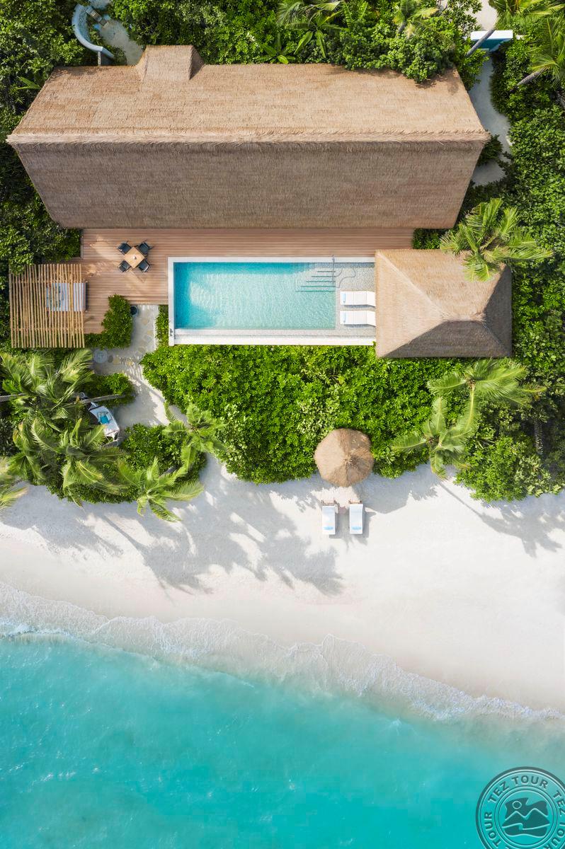 4 виллы 2 Bedroom Beach Villa with Pool (599 м2; макс. 5 или 4+2 чел.). Береговые виллы с двумя отдельными спальнями (одна с кроватью king-size; другая – с раздельными twin), гостиной. В каждой спальне ванная комната. Терраса с частным бассейном (15 х 4 м), диван-качели, гамак. Прямой выход на пляж.