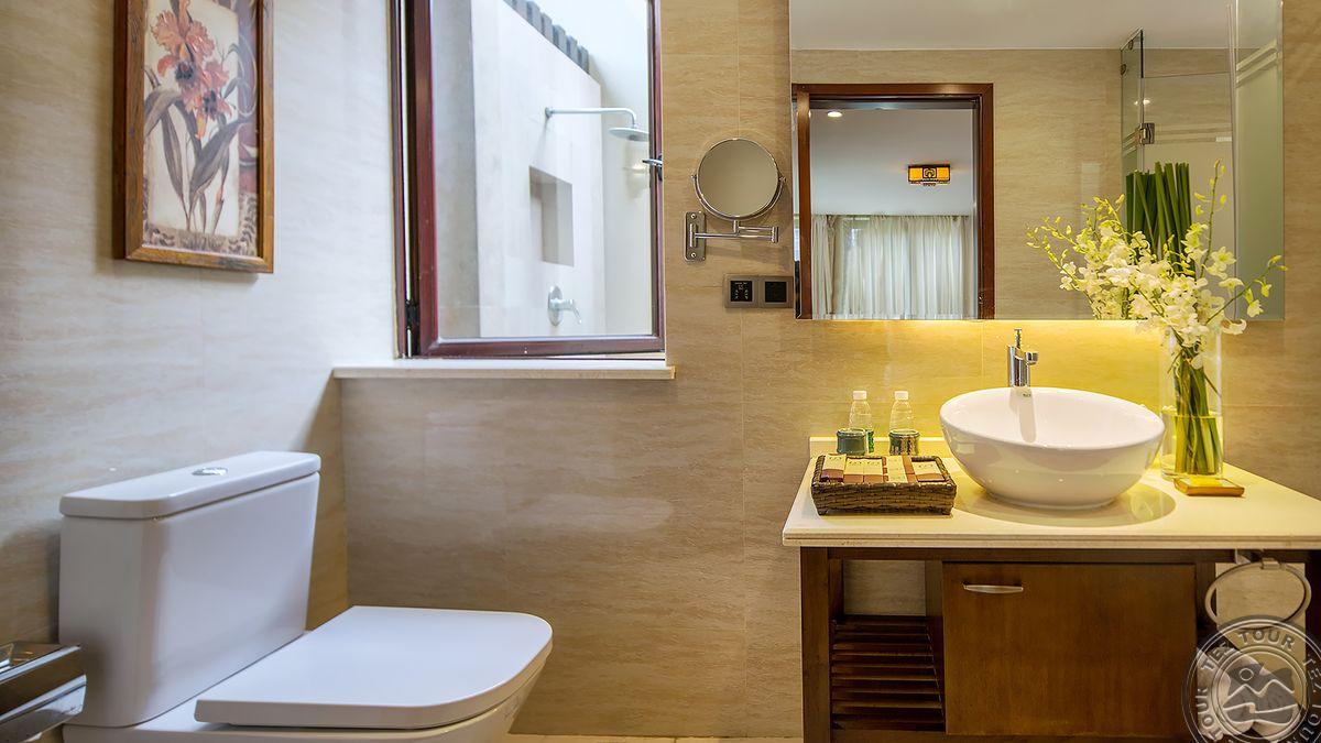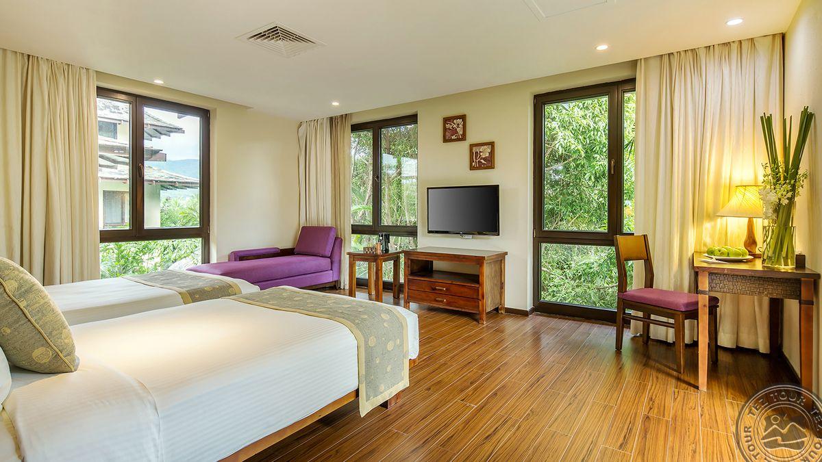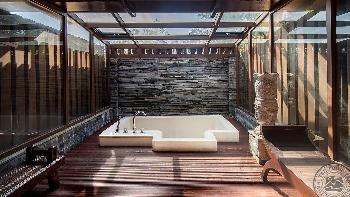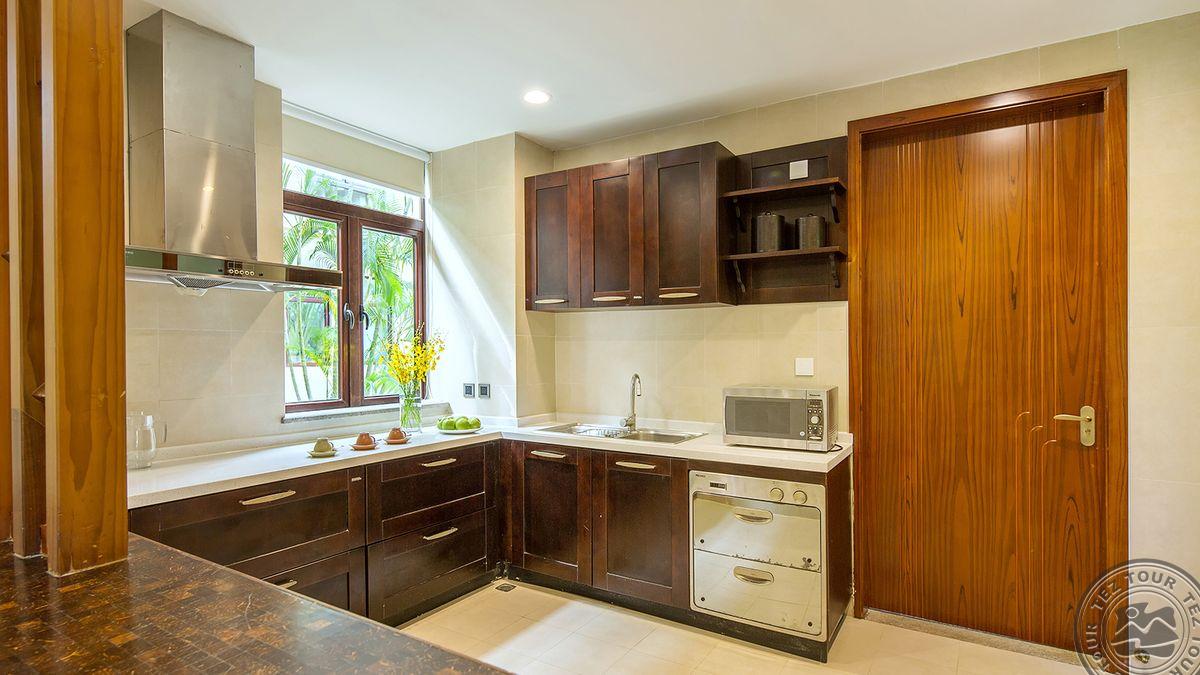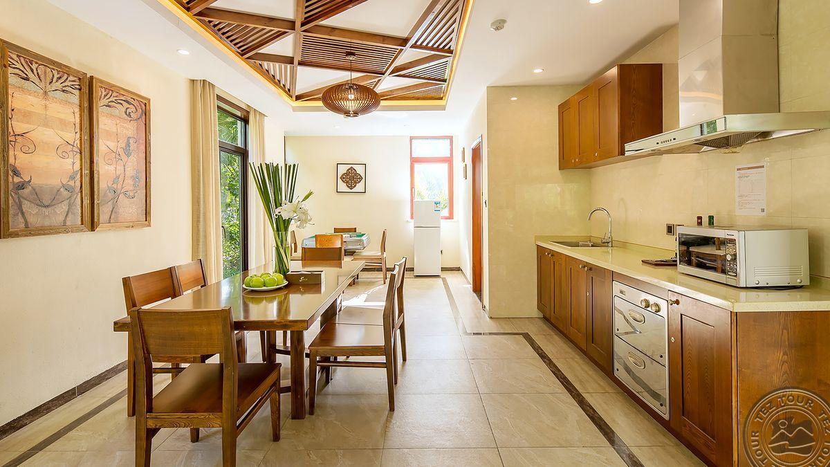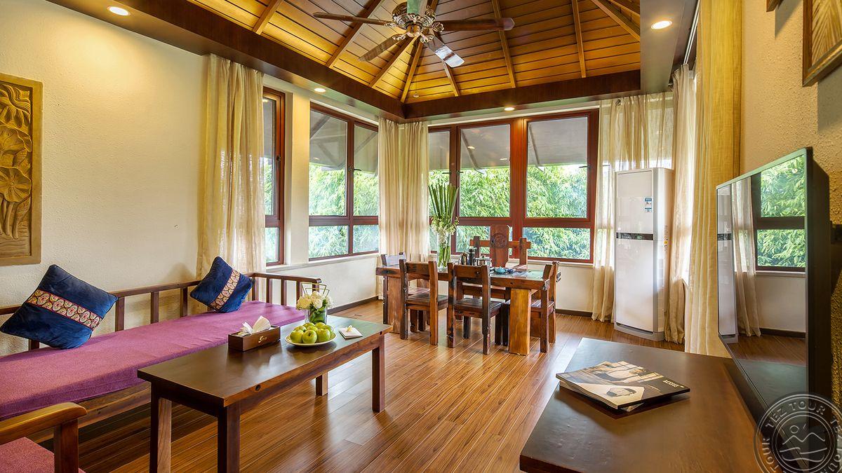 Номер:> сейф: есть уборка номера: по запросу (экосистема) смена белья: по запросу утюг: есть халат мини-холодильник телевизор: есть тапочки пляжные полотенца фен: есть кухня (во всех виллах кроме Honeymoon Villa, использование кухни платно от 150 юаней в день и выше в зависимости от используемой кухонной утвари) кондиционер: есть мини-бар платно ванна или душ балкон не во всех номерах смена полотенец: ежедневно room service: есть телефон набор для приготовления чая/кофе Интернет: Wi-Fi, бесплатно