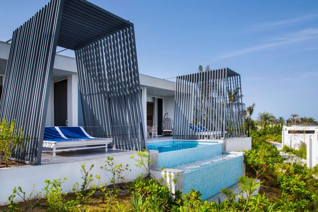 В отеле: оформленные в современном стиле виллы гармонируют с окружающим пейзажем и примечательны собственным бассейном с регулируемой температурой воды и французскими окнами, из которых открывается вид на Аравийское море.